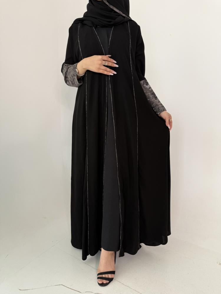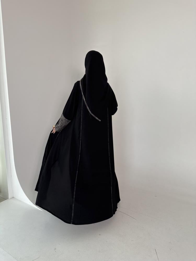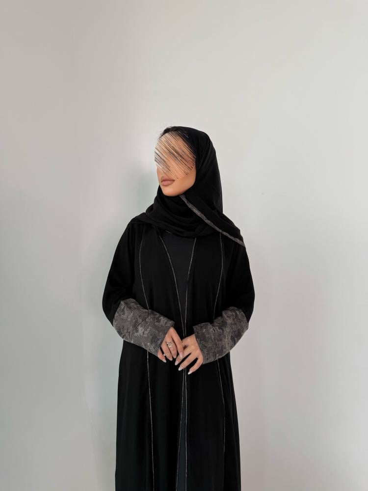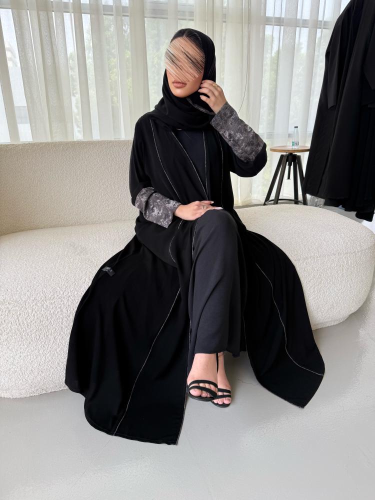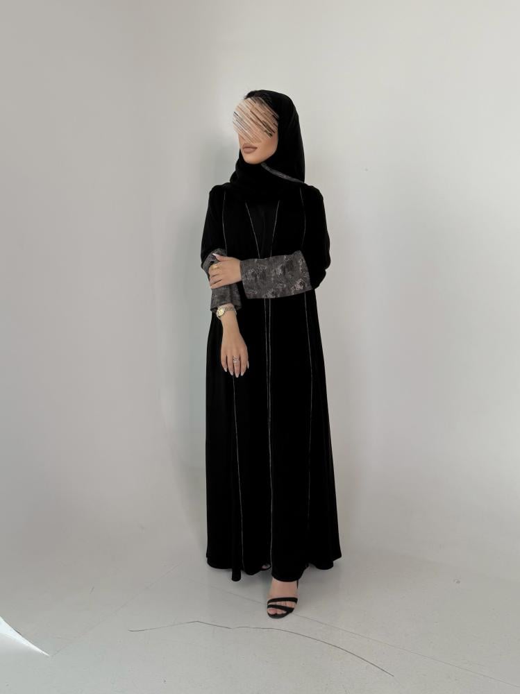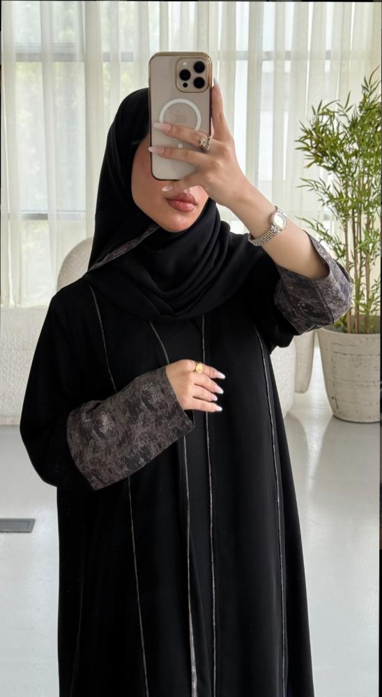 عباية ريفان تتكون من قماشين كريب و قماش تركي على الأكمام وقيطان من أمام ومن خلف بنفس القماش