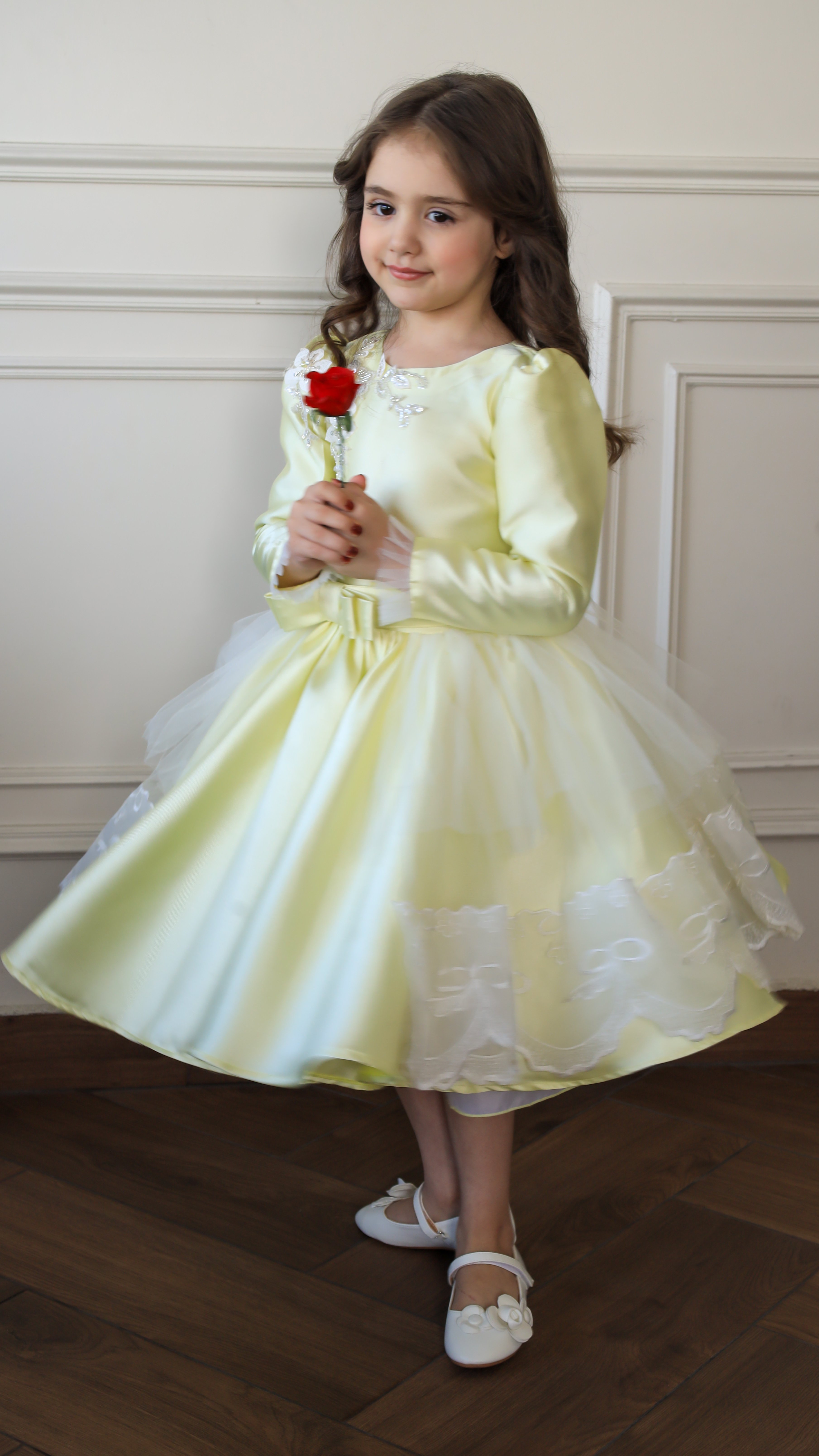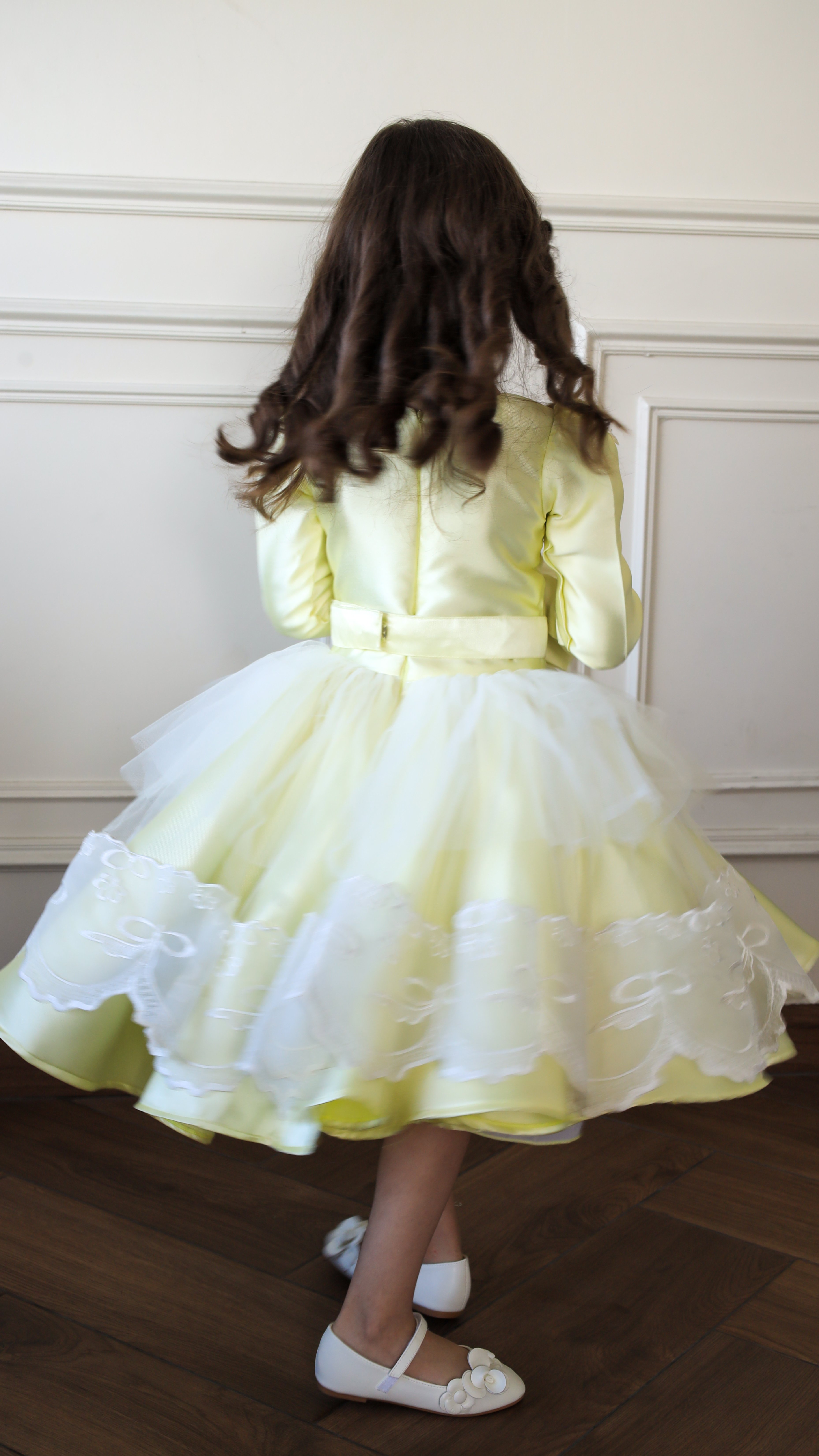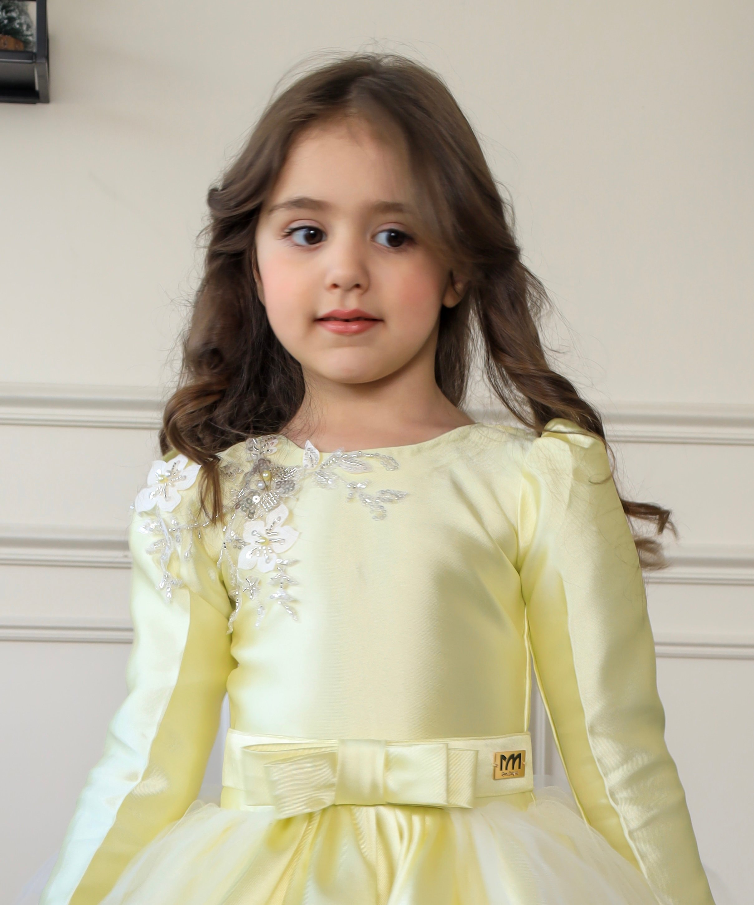 فستان ليموني فاخر مصمم من قماش التفته والتل مزين بتطريز بالصدر ،