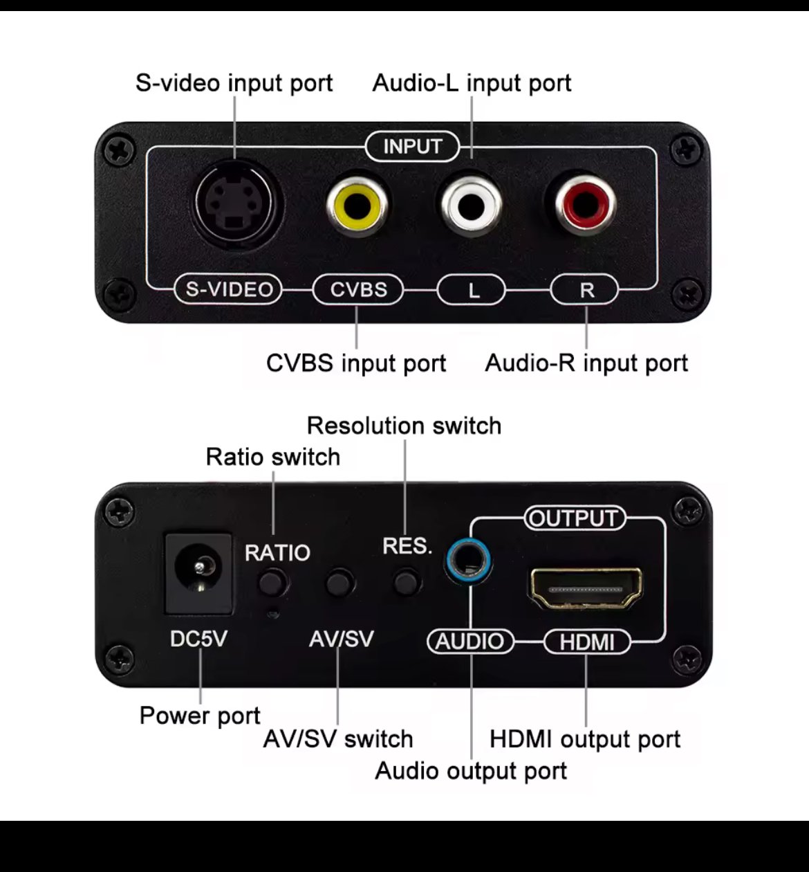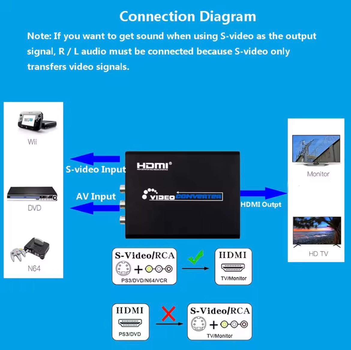 يحول هذا المحول RCA Svideo إلى المتوافق مع HDMI يحول إشارة مركبة أو S-video + صوت R/L إلى HDMI مما يمكنك مشاهد مقاطع الفيديو القياسية على أجهزة التلفزيون