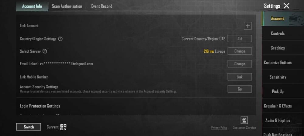 - تأكد من صور الحساب وامكانية تغيير السيرفر أو الدولة.