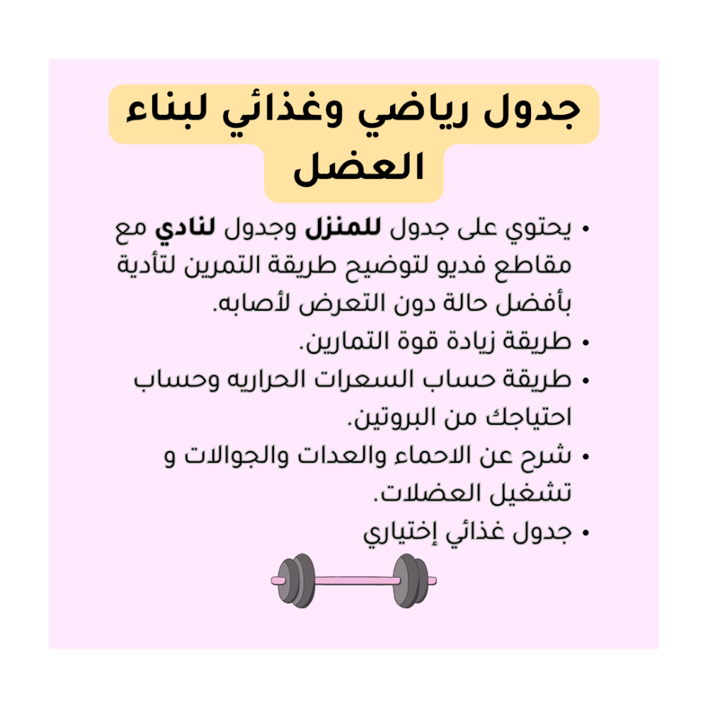 •جدول رياضي مع مقاطع فديو لتوضيح طريقة التمرين لتأدية بأفضل حالة دون التعرض لأصابه يحتوي على جدول لتمرين بالنادي وجدول لتمرين بالمنزل.