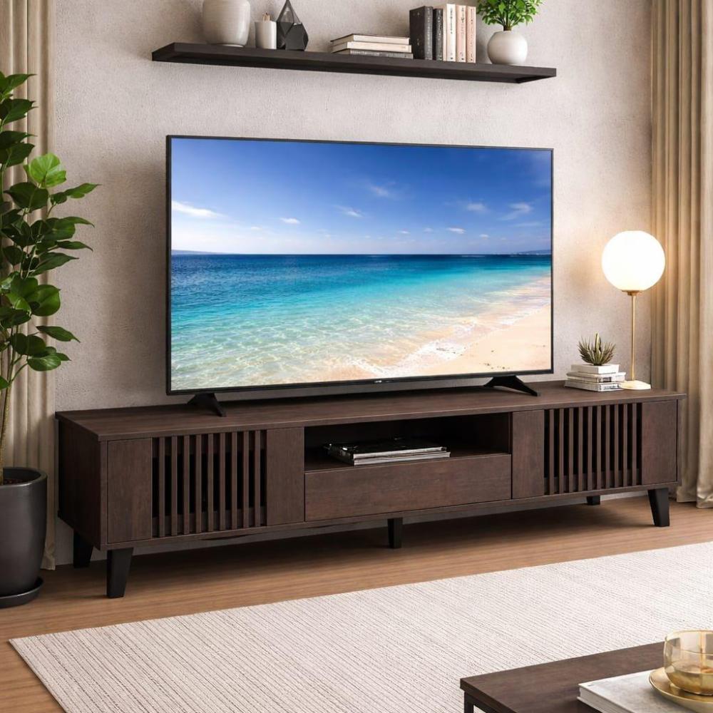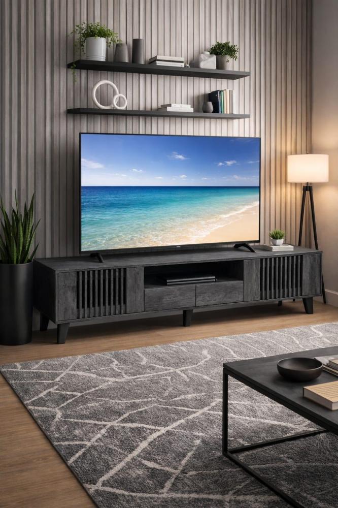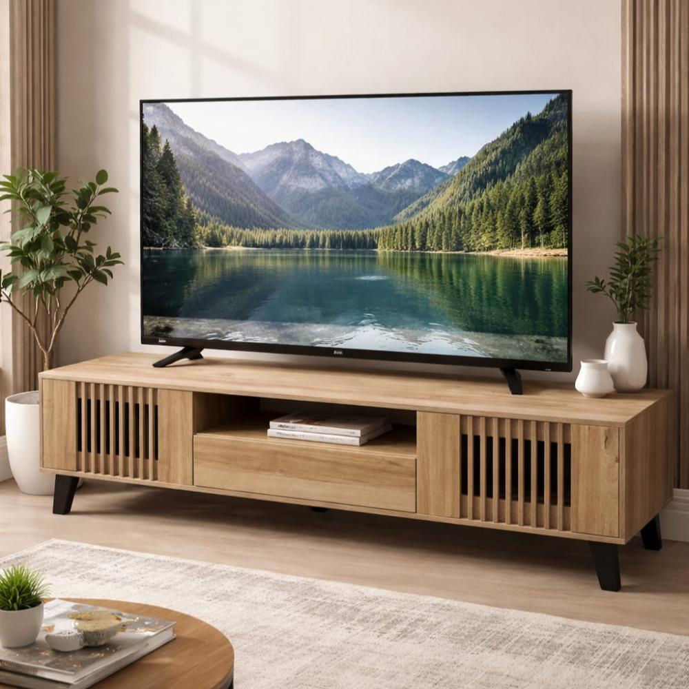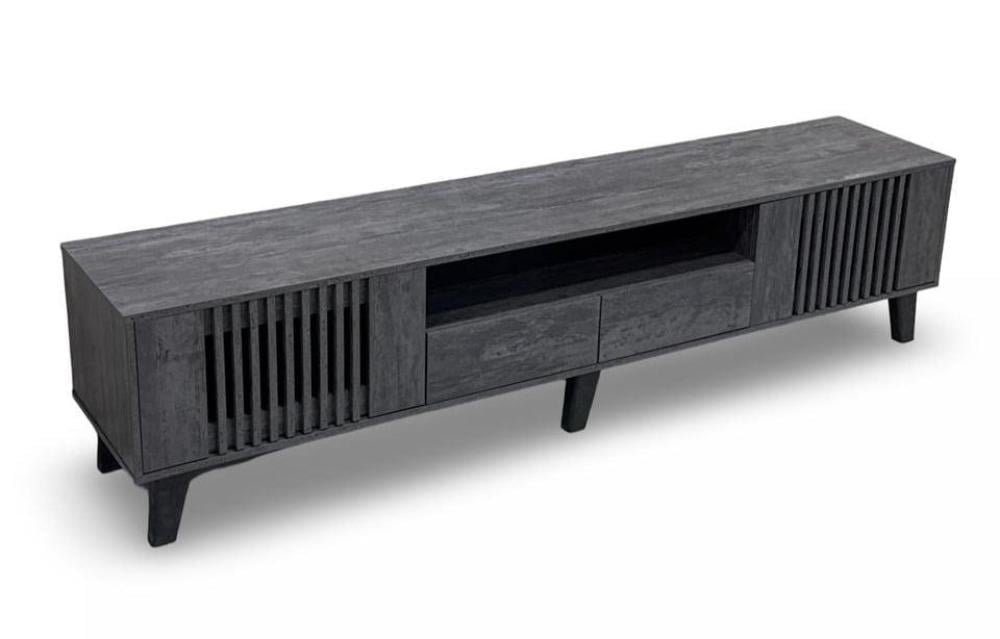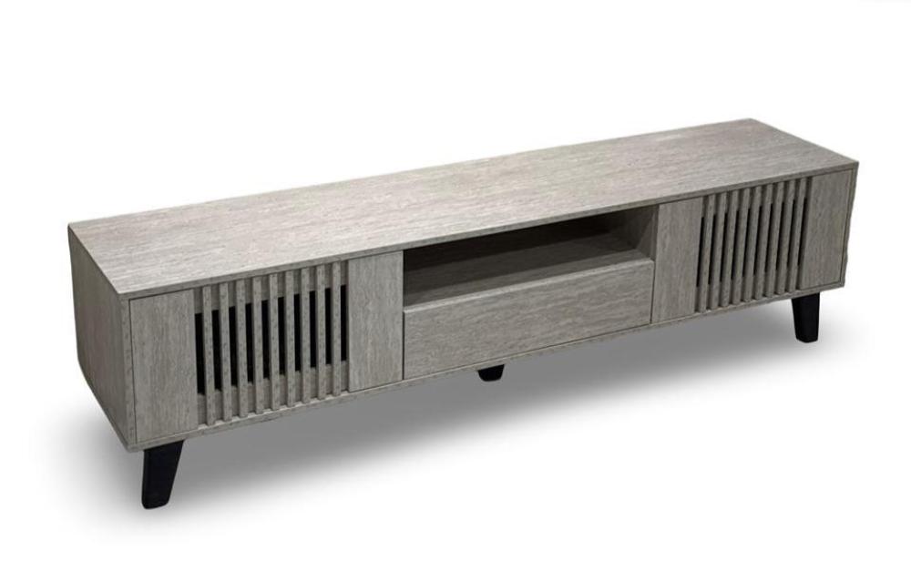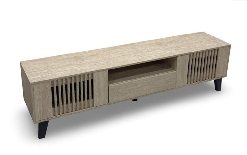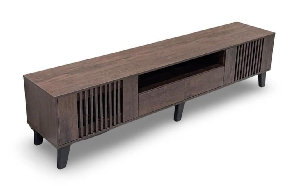 طاولة تلفاز عصرية وأنيقة، تتميز بالتصميم التالي: