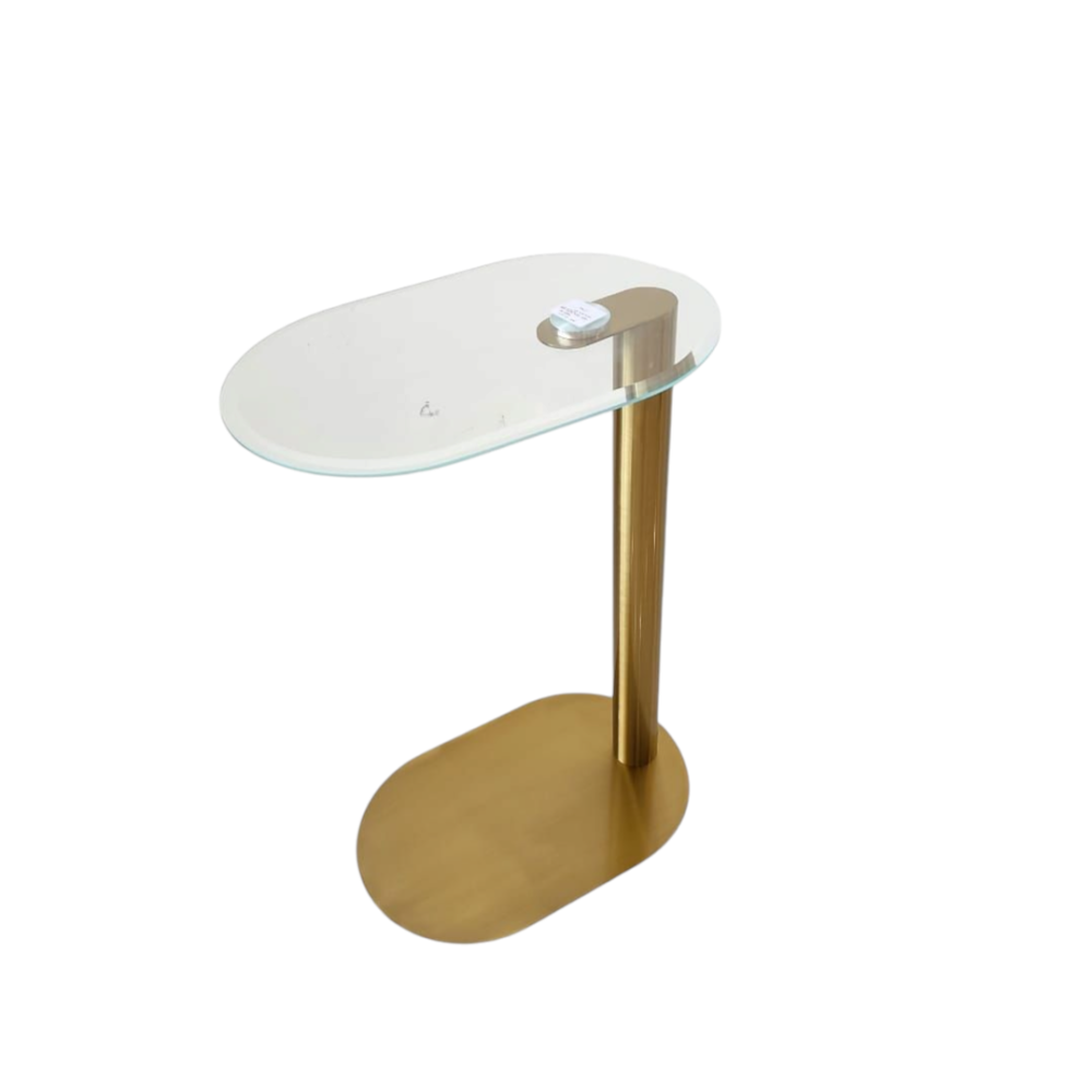 طاولة خدمة زجاجية تتميز بتصميم أنيق وعصري. تتكون الطاولة من سطح زجاجي شفاف بيضاوي الشكل، وقاعدة من الاستيل بنمط ، وعمود معدني استيل يربط بين السطح والقاعدة.