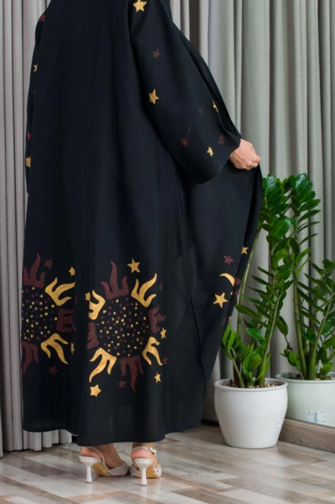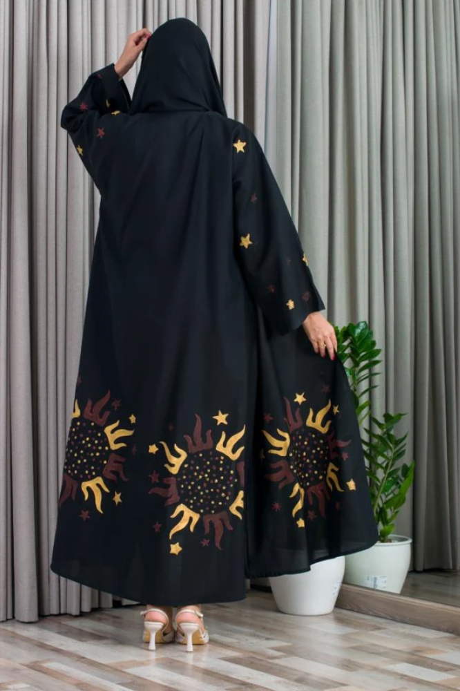تميزي بإطلالة عصرية وأنيقة مع عباية مايا بطبعة المصممة خصيصًا للسيدات الباحثات عن التميز والراحة. تجمع هذه العباية بين الراحة والفخامة بفضل القماش كريب شمالي عالي الجودة، مما يضمن لكِ شعورًا بالراحة طوال اليوم. تأتي العباية بتصميم مفتوح من الأمام مع أكمام واسعة مزينة بطبعة أنيقة، بينما الطرحة المتناسقة تبرز إطلالتك بشكل كامل. يتميز التصميم باللون الأسود مع طبعات ذهبية وبنية تضفي لمسة من الفخامة.
