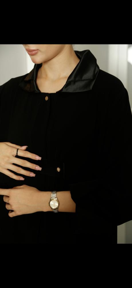 نوع القماش : الكريب الملكي : هو واحد من أرقى أنواع الأقمشة ويُعرف بجودته العالية وسواده الفاحم ومظهره الفاخر.