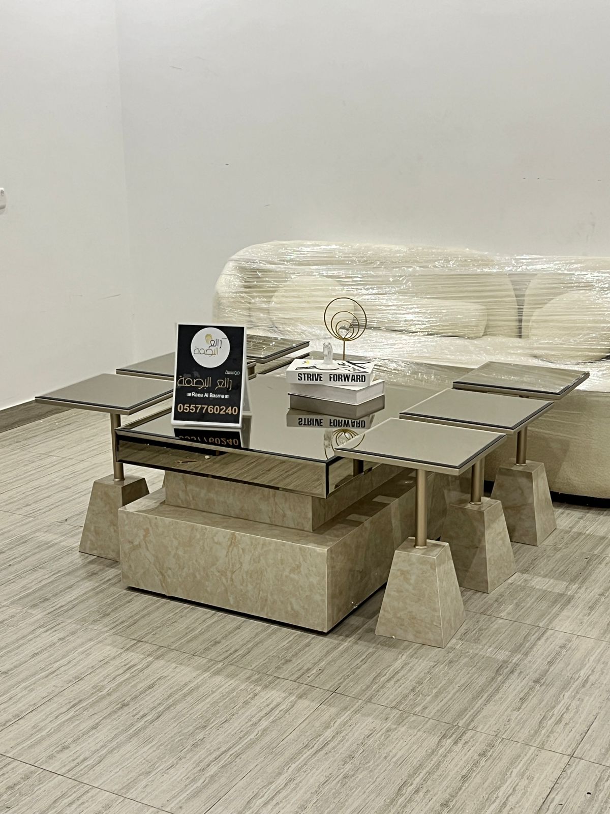 - **المادة:** سطح بديل الرخام عالي الجودة مع إضافة زجاج عسلي وإطار معدني قوي يوفر المتانة والاستقرار.