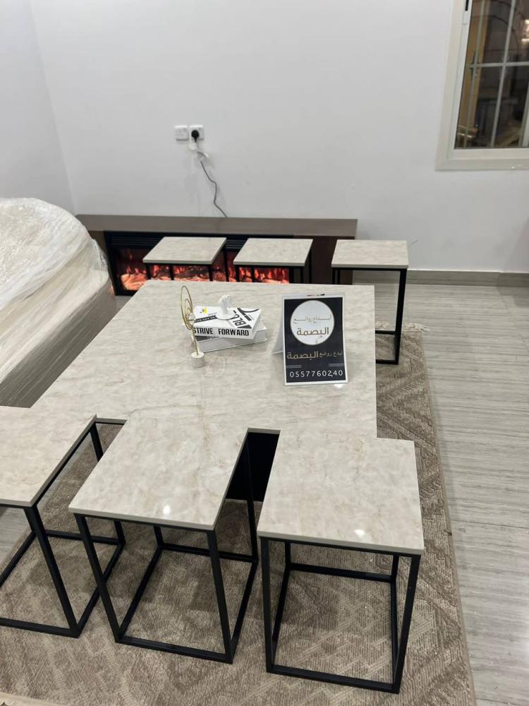 - **الطاولة الكبيرة:** مصنوعة من سطح بديل الرخام عالي الجودة مع قاعدة معدنية متينة. التصميم العصري يجمع بين الاستقرار والأناقة.