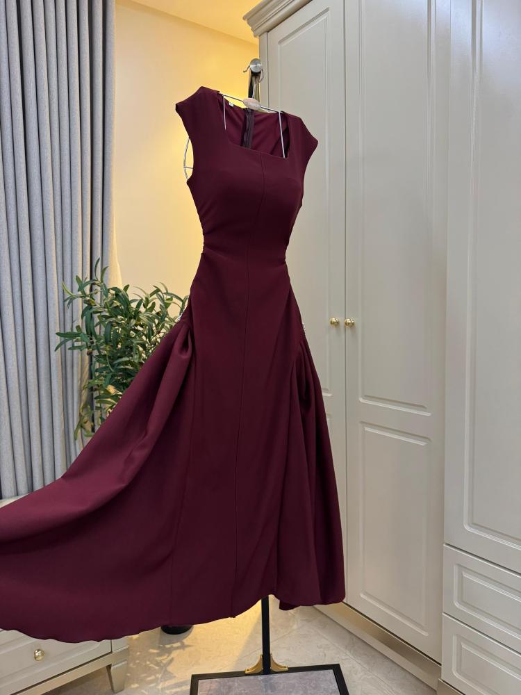 * التصميم العام: فستان سهرة أنيق بتصميم بسيط وأنثوي. يتميز بقصة تحدد الجسم وتنورة واسعة.
