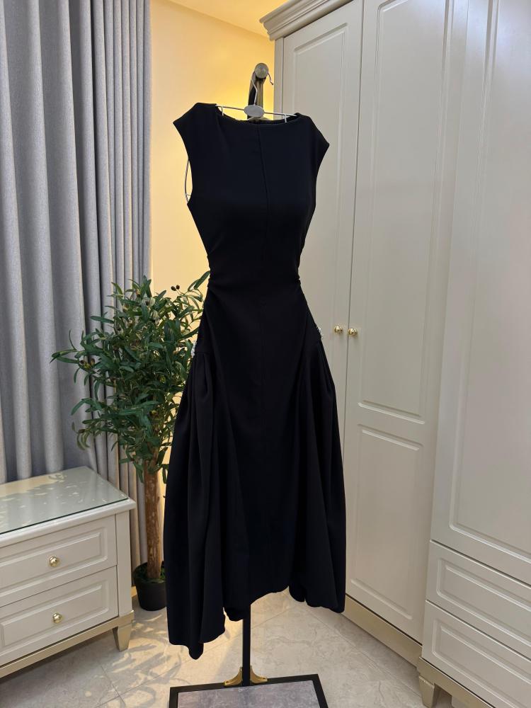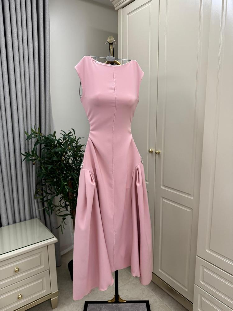 * اللمسات النهائية: يزين الفستان حزام من نفس القماش مع إبزيم مرصع بالكريستال.