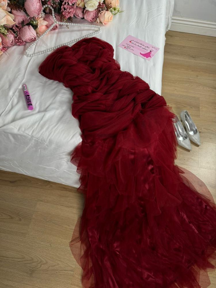 يتميز بتصميم فاخر ومناسب للمناسبات الخاصة. الفستان بدون أكمام، ومصمم بقصة ضيقة من الأعلى تتسع في الأسفل مع طبقات من الكشكش تضيف لمسة من الأناقة والأنوثة. التصميم الكلاسيكي يجعله مثالياً للسهرات والحفلات. الإكسسوارات المستخدمة، مثل العقد، تضيف لمسة من البريق إلى المظهر العام.