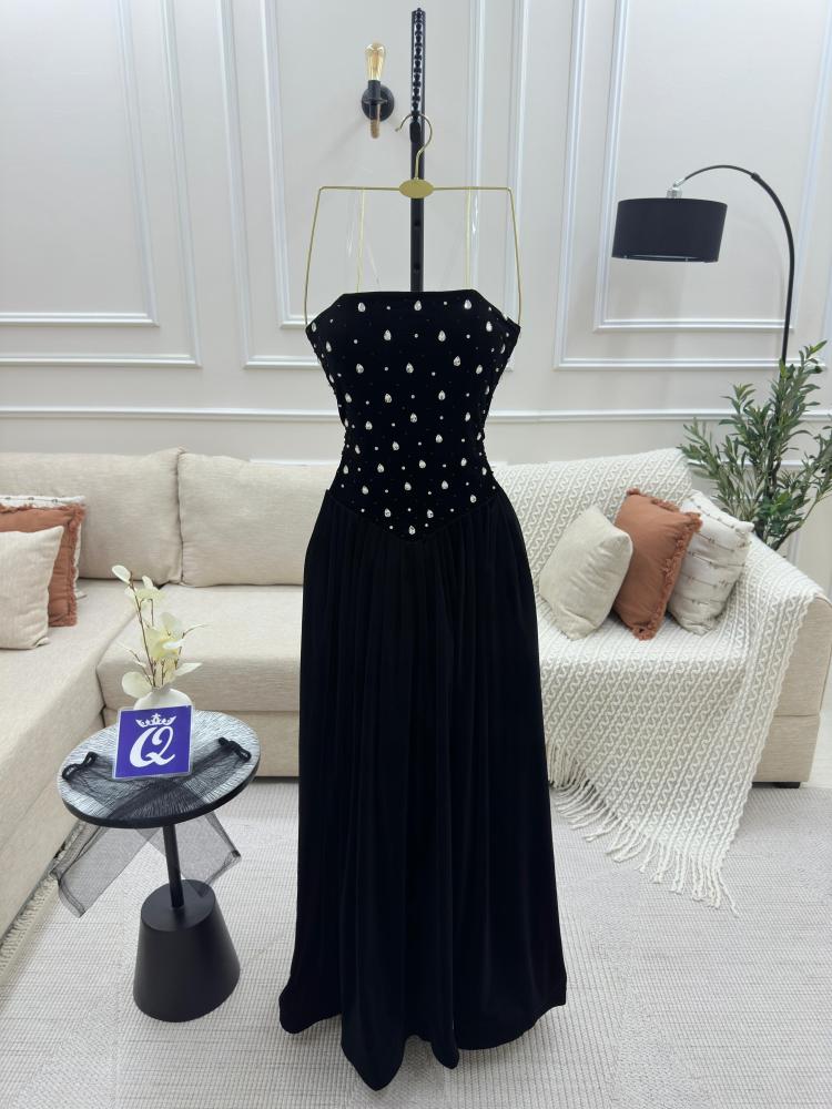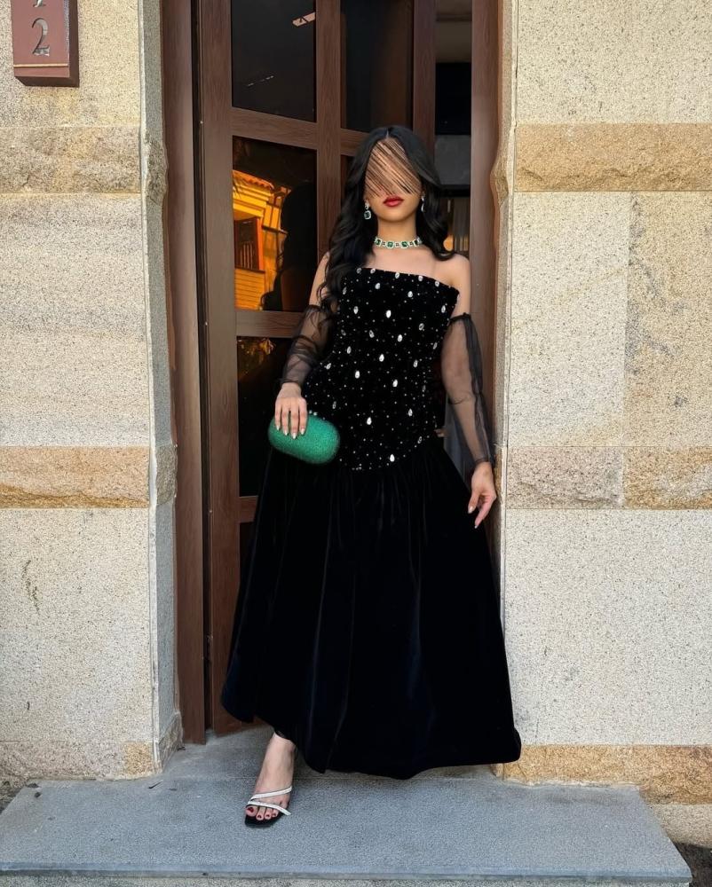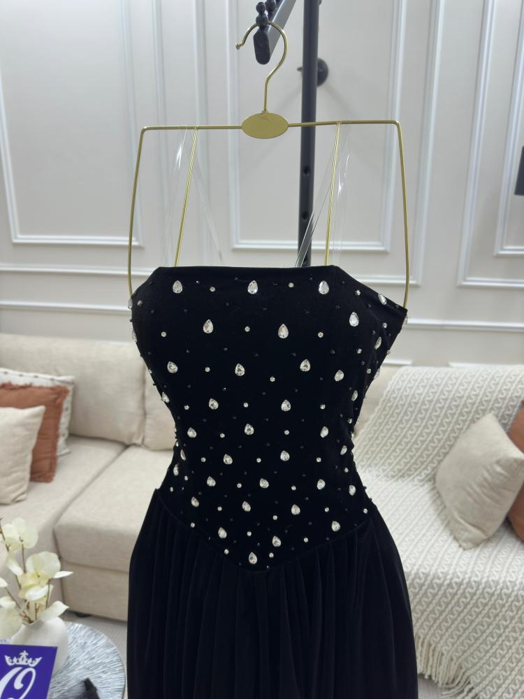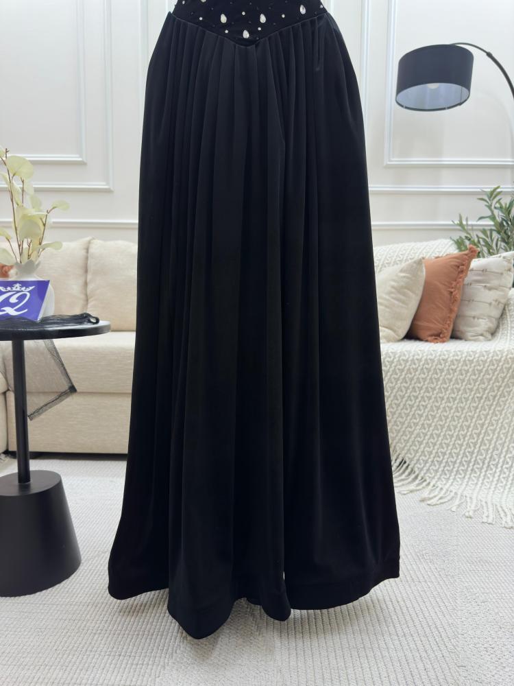 فستان سهرة طويل من المخمل الأسود الفاخر، يتميز بتصميم أنيق وعصري. يتميز الفستان بقصّة ضيقة عند الخصر تبرز أنوثتك، مع تنورة واسعة تتدفق بأناقة. يزين الجزء العلوي من الفستان تطريزات براقة من الخرز والكريستال، مما يضفي لمسة من الفخامة والأناقة. الفستان مثالي للمناسبات الخاصة والحفلات، ويمنحك إطلالة لا تُنسى.