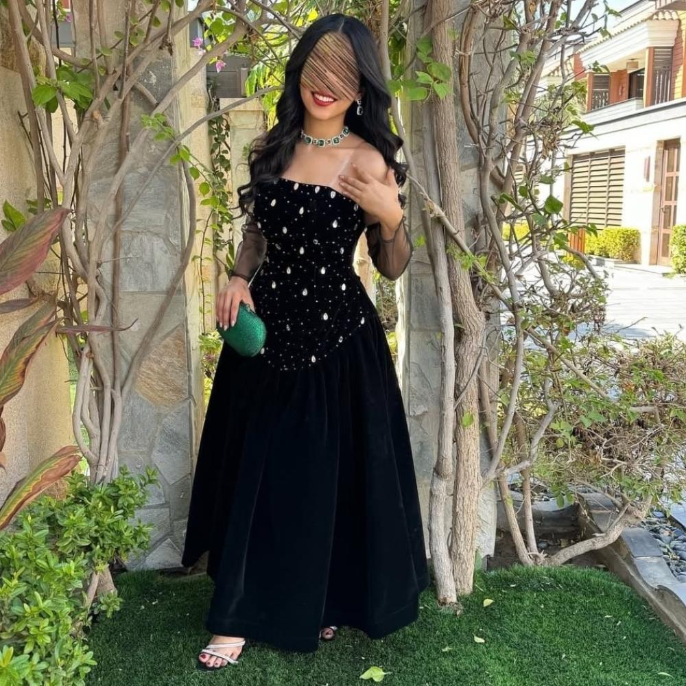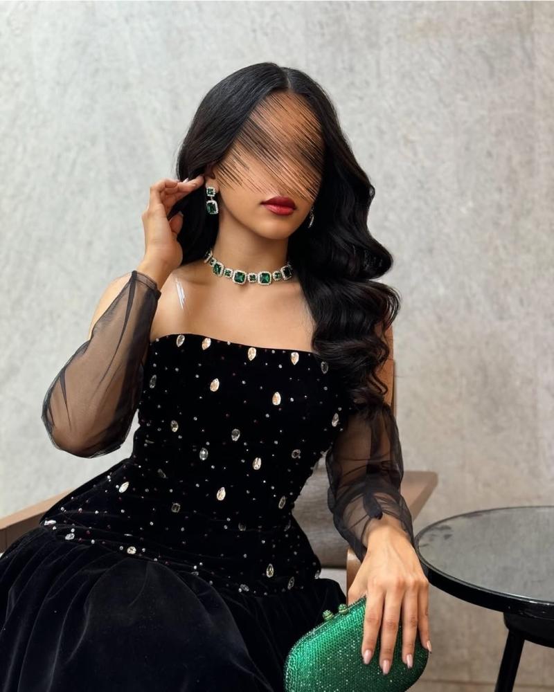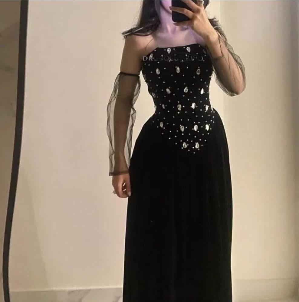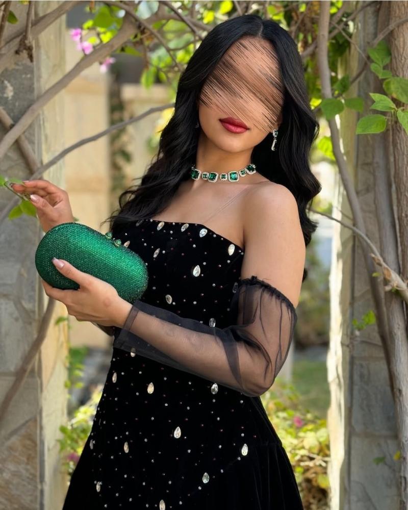 فستان سهرة طويل من المخمل الأسود الفاخر، يتميز بتصميم أنيق وعصري. يتميز الفستان بقصّة ضيقة عند الخصر تبرز أنوثتك، مع تنورة واسعة تتدفق بأناقة. يزين الجزء العلوي من الفستان تطريزات براقة من الخرز والكريستال، مما يضفي لمسة من الفخامة والأناقة. الفستان مثالي للمناسبات الخاصة والحفلات، ويمنحك إطلالة لا تُنسى.