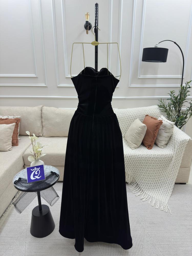 صورة لفستان سهرة أسود طويل من المخمل، بتصميم أنيق وعصري. يظهر الفستان على مانيكان في غرفة أنيقة، مما يعكس جودته وفخامته. يبرز التصميم التفاصيل الدقيقة للفستان، مثل التطريزات البراقة والقصّة الانسيابية.