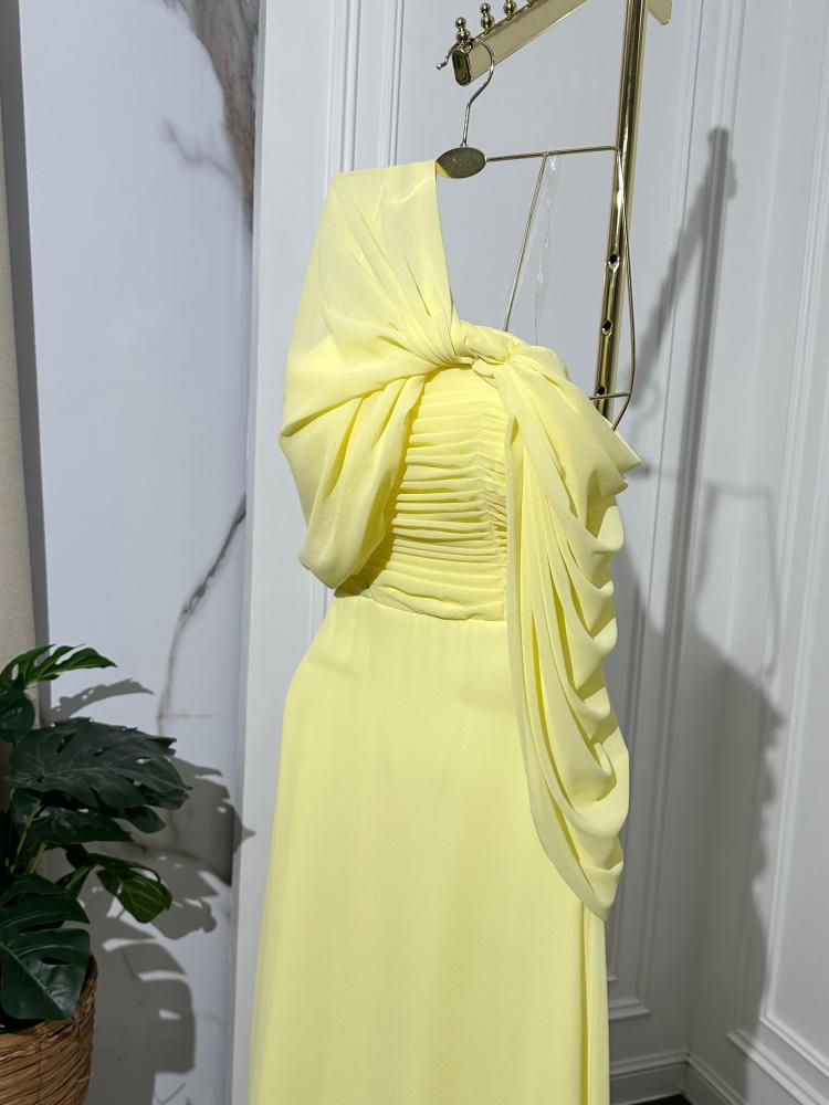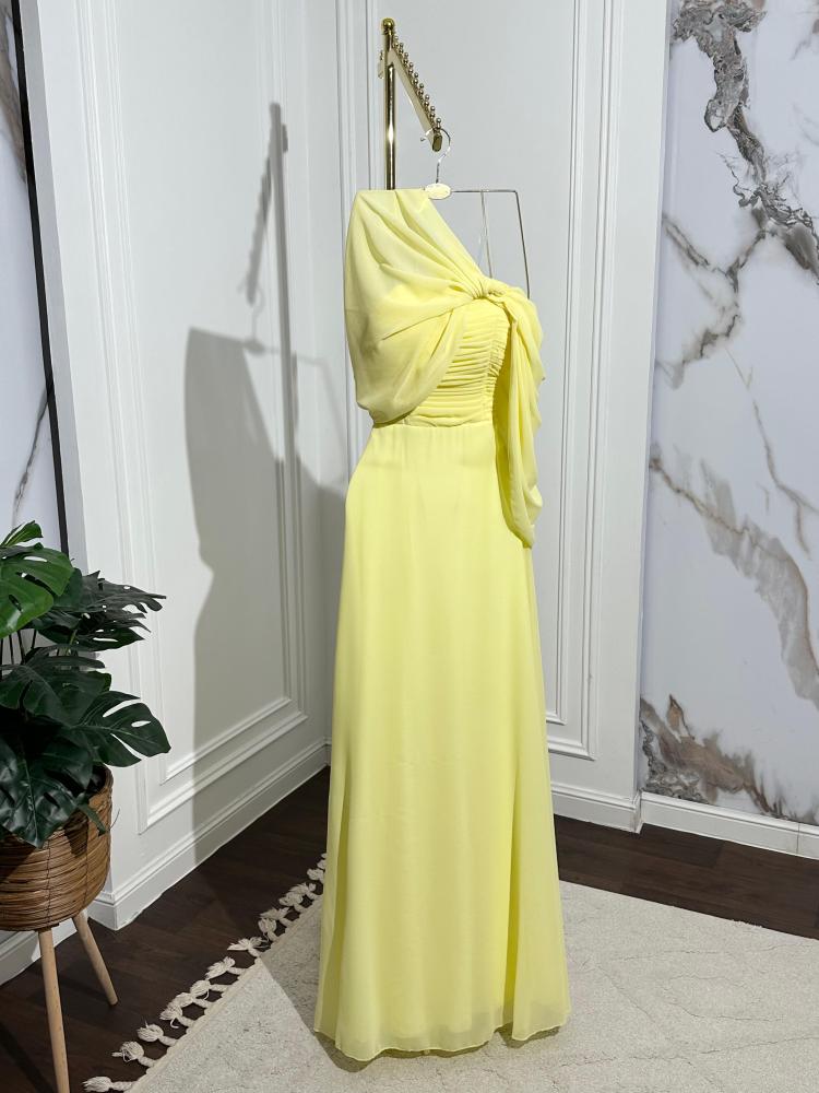 فستان سهرة طويل بقصّة أنيقة مستوحاة من أحدث صيحات الموضة. يتميز الفستان بكتف واحد مكشوف يبرز جمال العضد، وقماش شيفون خفيف الوزن يتدفق برشاقة مع كل حركة. يضيف تصميم العقدة الأنيقة على الكتف لمسة من الرقي والأناقة، مما يجعله مثاليًا للمناسبات الخاصة.