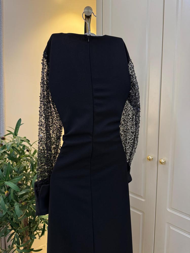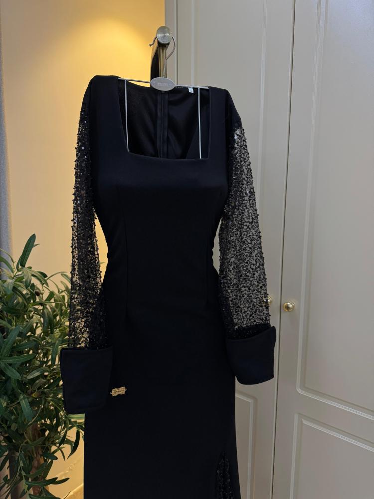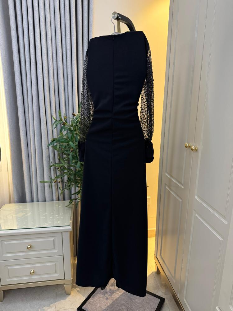 * التصميم العام: فستان سهرة طويل بتصميم أنيق وأنثوي. يتميز الفستان بقصة مستقيمة مع فتحة جانبية تضفي عليه لمسة جريئة. الأكمام طويلة وشفافة، مما يزيد من جاذبية التصميم.