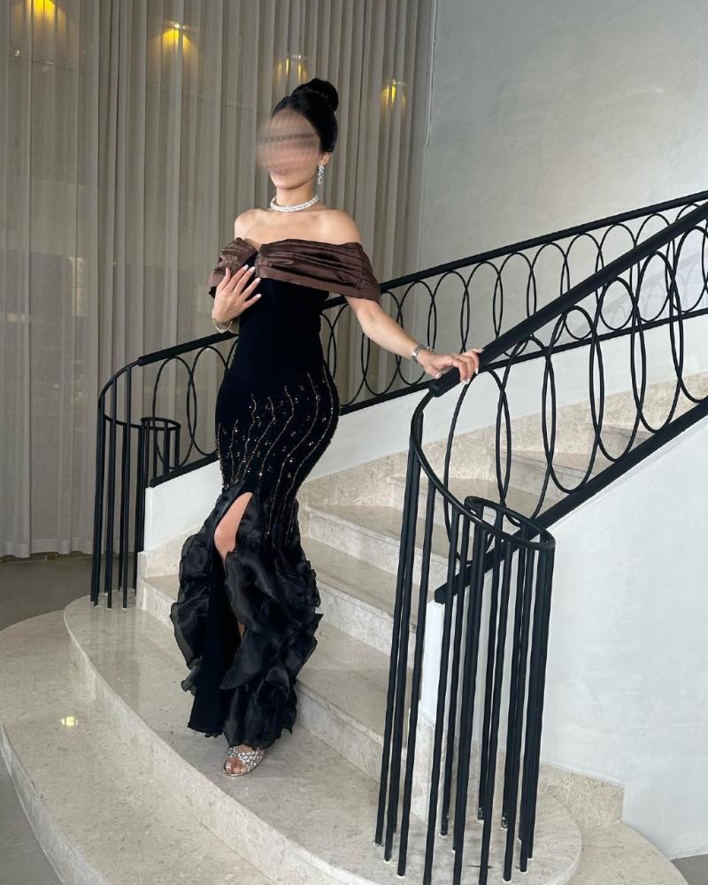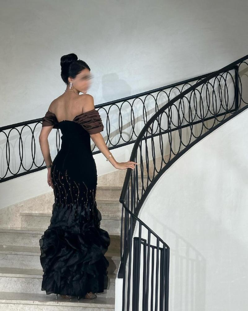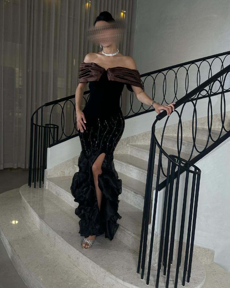 فستان سهرة ناعم وانيق , اروع تصميم الفساتين , فستان مكشوف الكتف , فستان متألق , فستان سهرة فخم , فستان سهرة ,