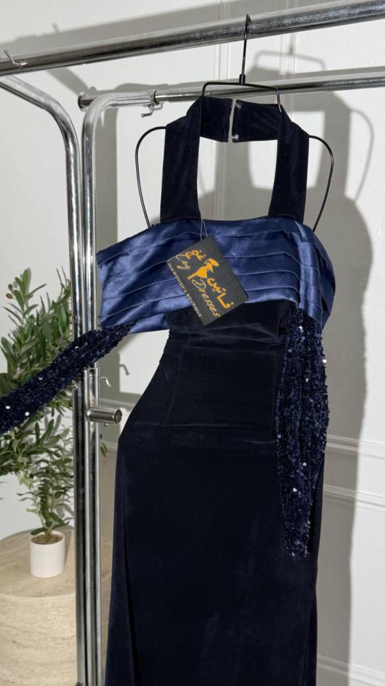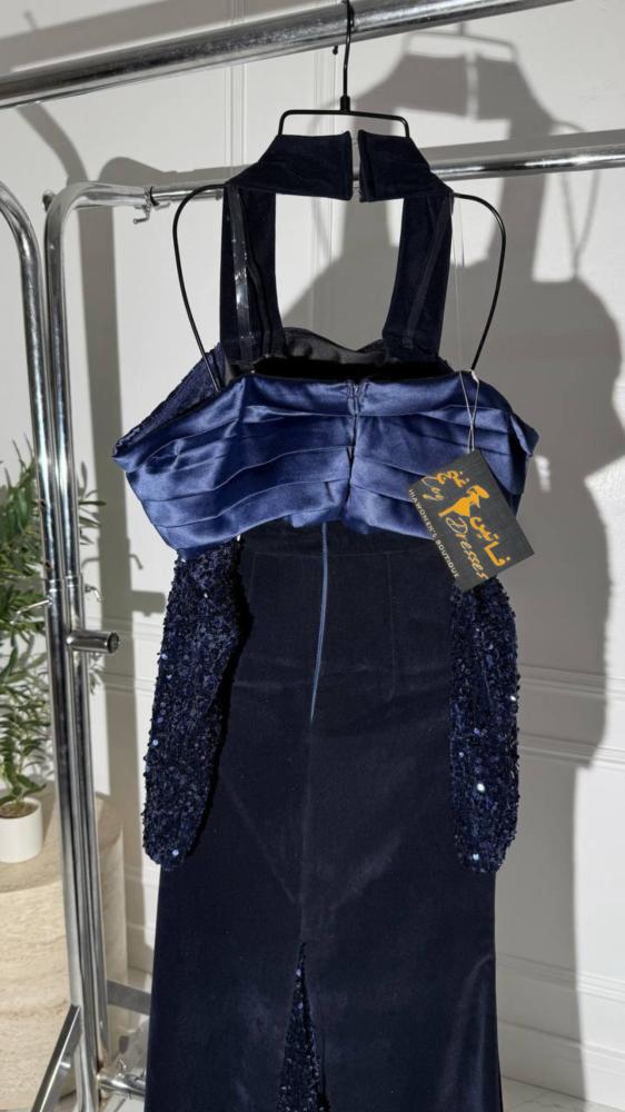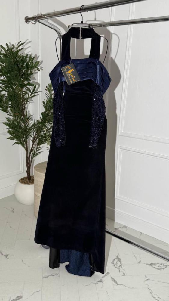 * فستان مخمل كحلي أنيق: تصميم كلاسيكي وعصري في آن واحد، مثالي للمناسبات الخاصة.