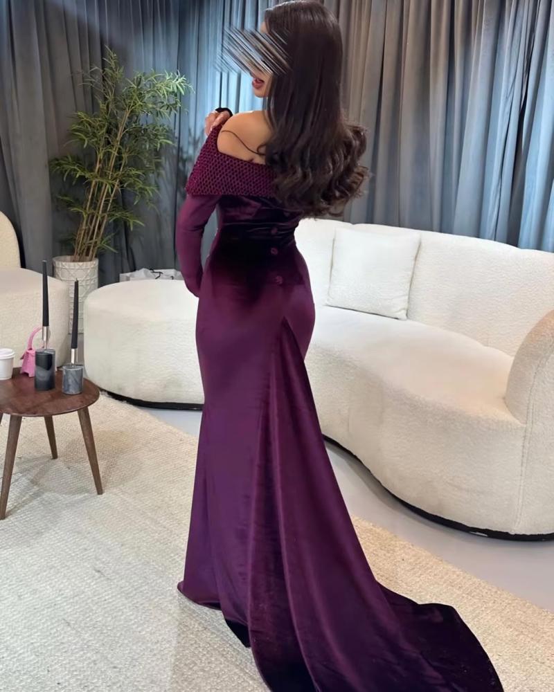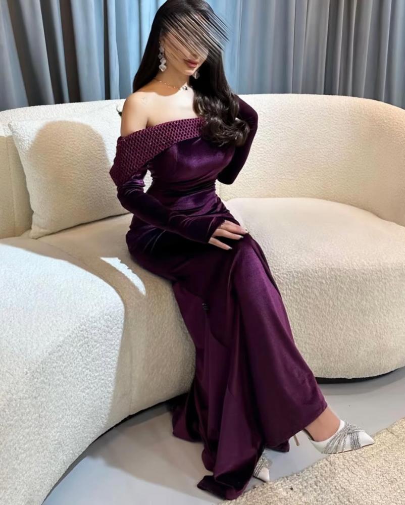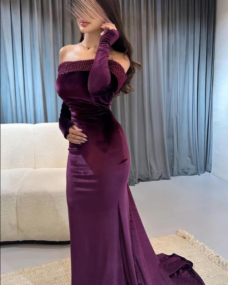 * قصّة الأكتاف: يتميز الفستان بقصّة أكتاف عارية (Off-shoulder) تبرز جمال منطقة الرقبة والكتفين.