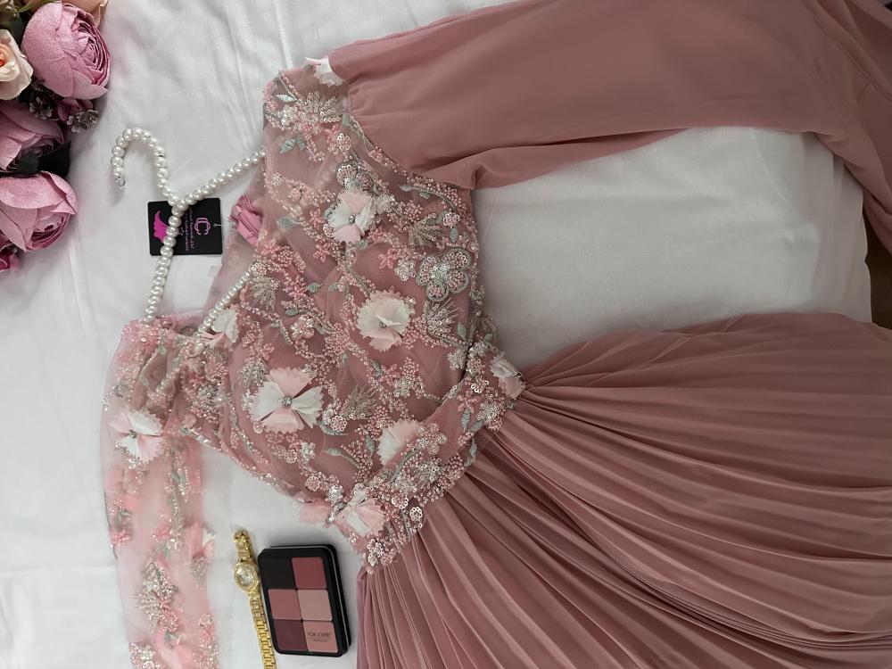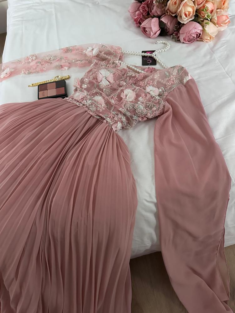 الخامه :شيفون ناعم راقي ككلووش دبل مبطن مكسر + قماش مورد راااقي تصميم حديث يعطي الفستان انتبه مميز بين الون لحمي والالوان الهاديه بالتشجيره الابيض على تيفاني