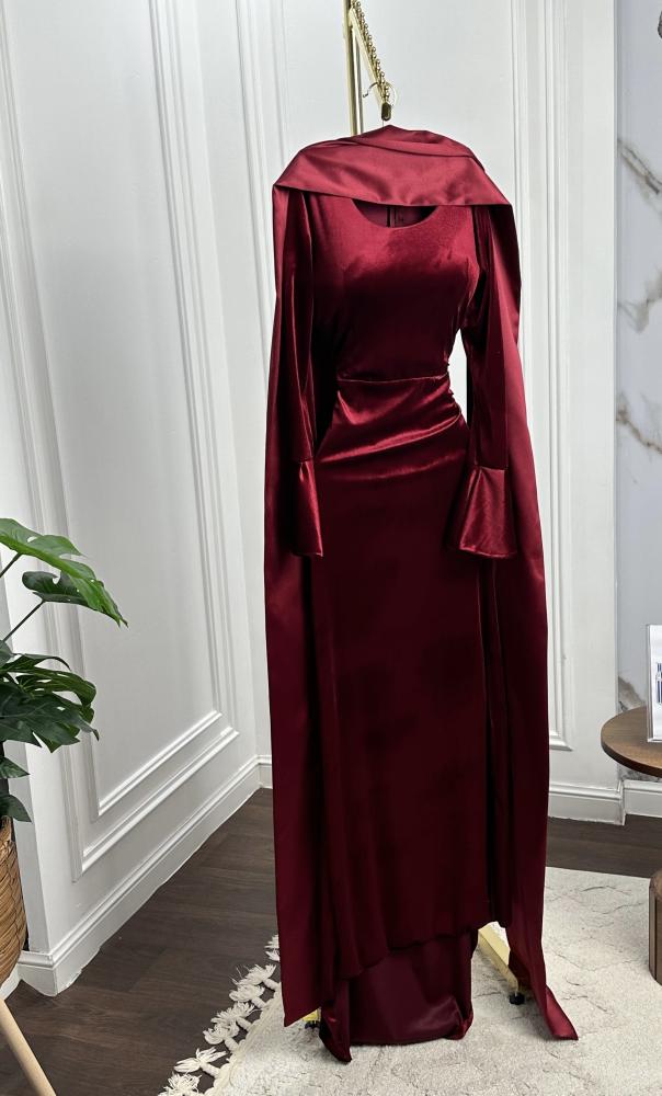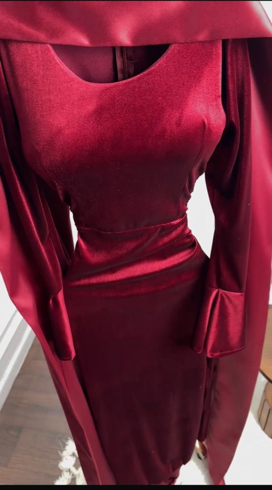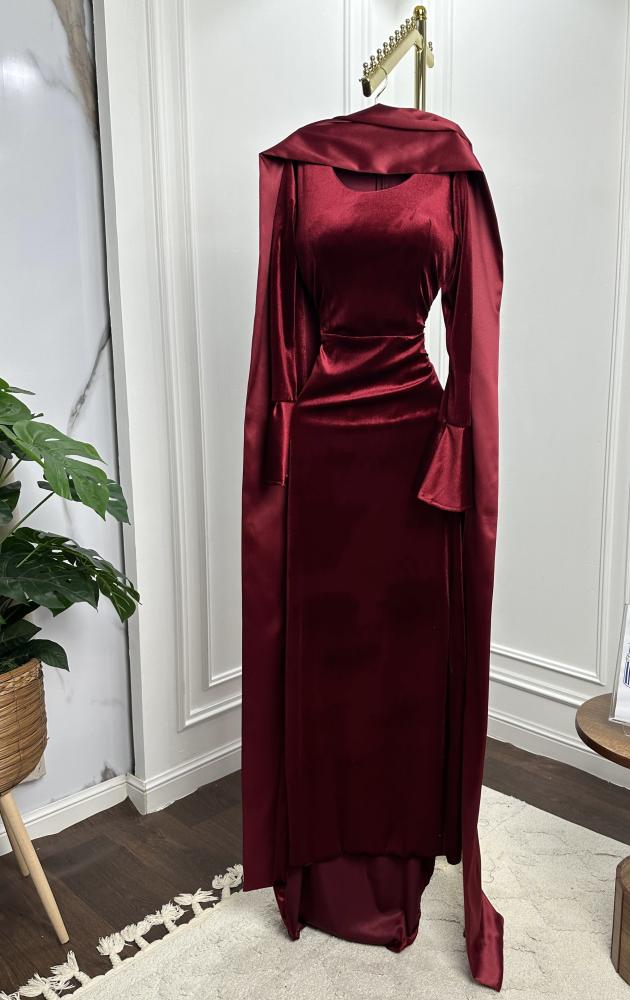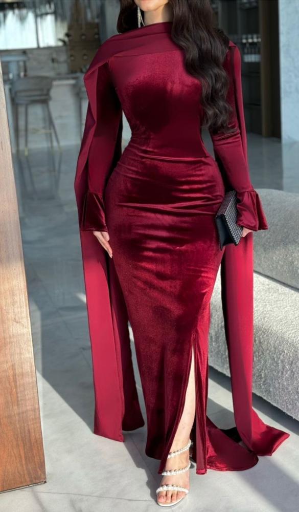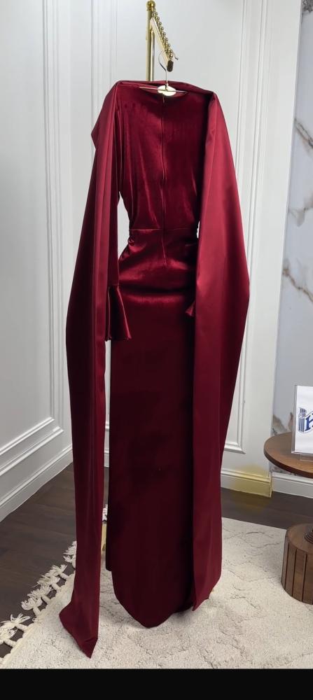 فستان سهرة طويل مصنوع من أجود أنواع الحرير المخمل، يجمع بين الأناقة والرقي. يتميز بلونه الأحمر البورجوندي الجذاب الذي يبرز جمال أي سيدة. يمتاز الفستان بتصميمه الانسيابي الذي يبرز قوام الجسم، وشاله الواسع الذي يضيف لمسة من الفخامة والدراما. هذا الفستان هو الخيار الأمثل للمناسبات الخاصة مثل حفلات الزفاف أو السهرات الراقية.