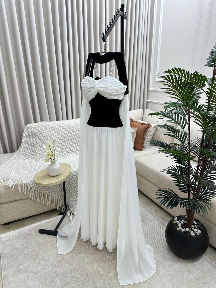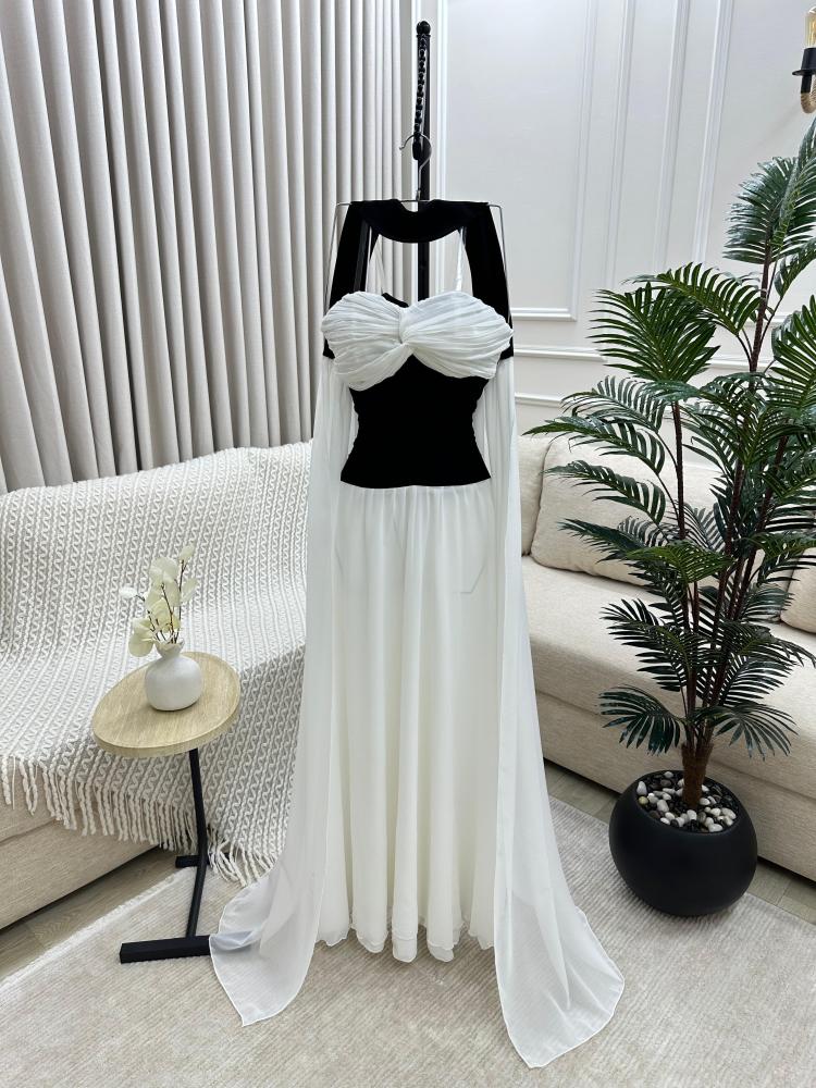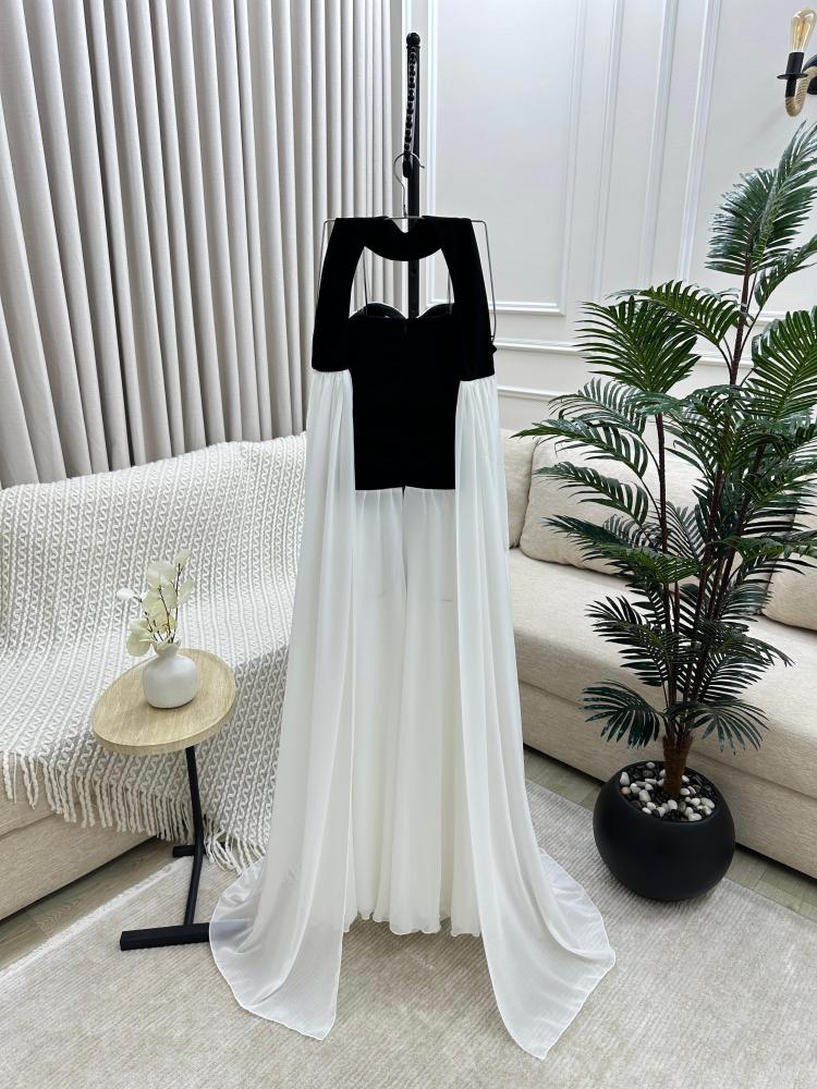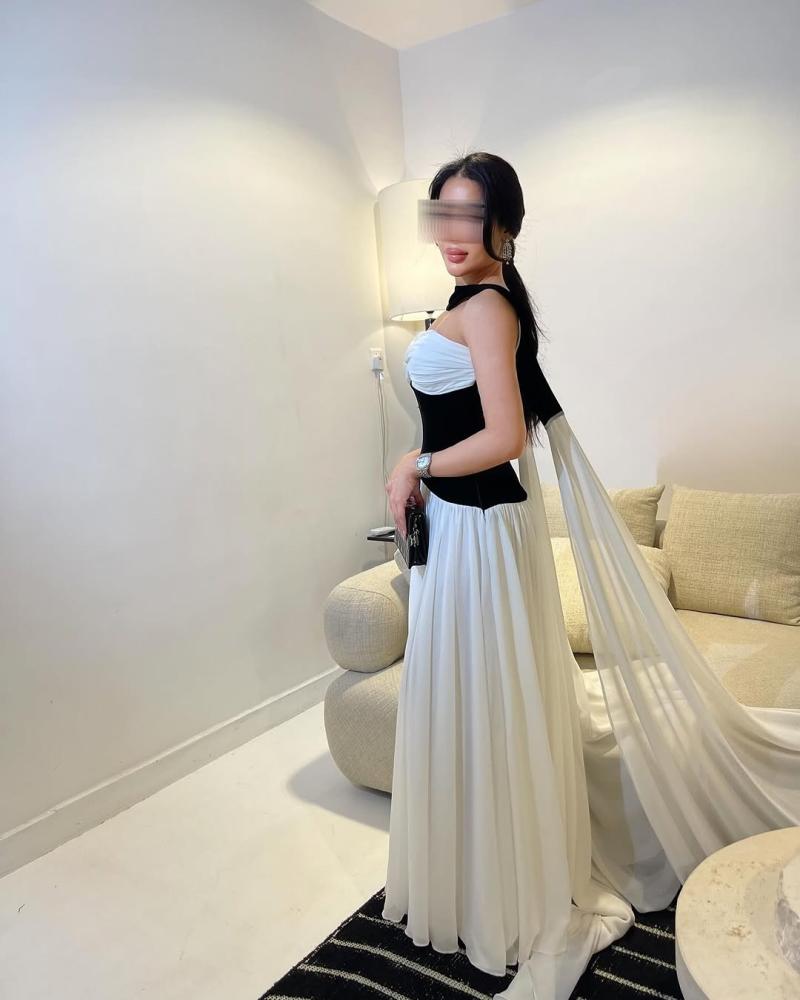 "فستان سهرة طويل بتصميم أنيق وعصري، مصنوع من قماش الكريب الشيك والشيفون الناعم. يتميز الفستان بقصّة ضيقة تبرز القوام، وياقة عارية الأكتاف مع كشكشة أنيقة تزيده جاذبية. الأكمام الطويلة من الشيفون تضيف لمسة من الرقي والأناقة. مثالي لحفلات الزفاف والمناسبات الخاصة."