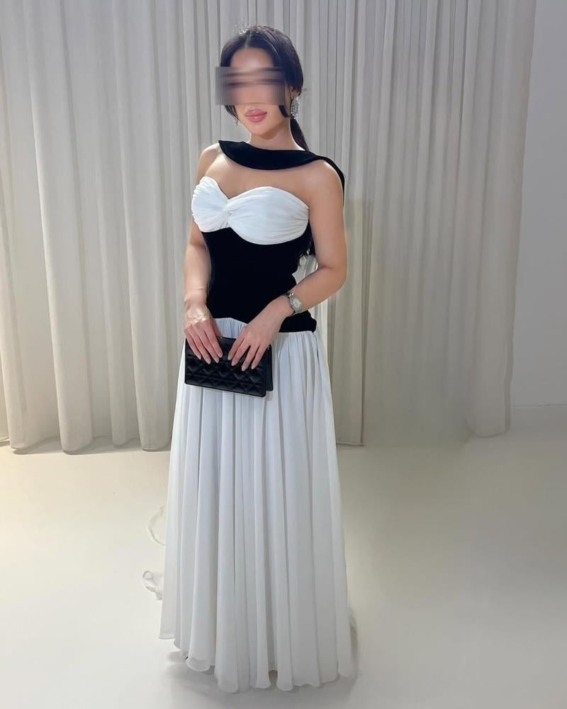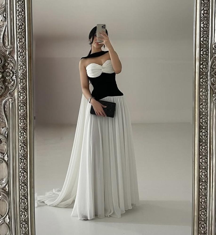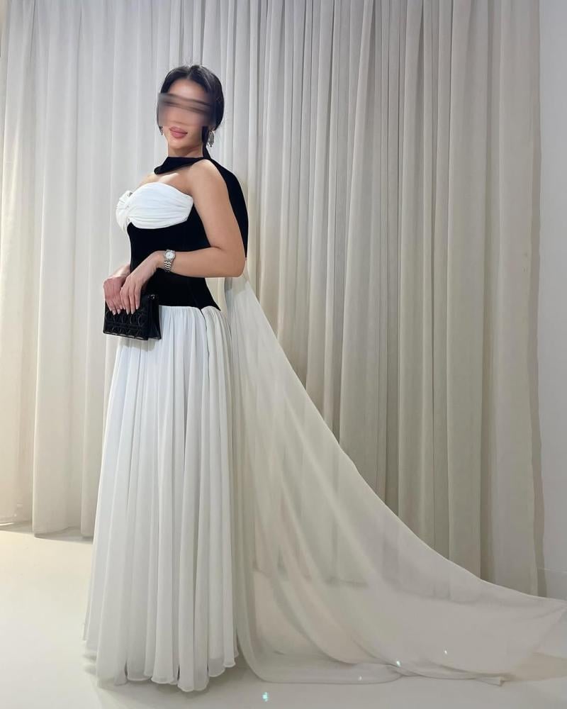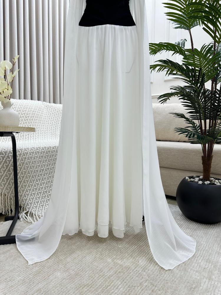 "فستان سهرة طويل بتصميم أنيق وعصري، مصنوع من قماش الكريب الشيك والشيفون الناعم. يتميز الفستان بقصّة ضيقة تبرز القوام، وياقة عارية الأكتاف مع كشكشة أنيقة تزيده جاذبية. الأكمام الطويلة من الشيفون تضيف لمسة من الرقي والأناقة. مثالي لحفلات الزفاف والمناسبات الخاصة."