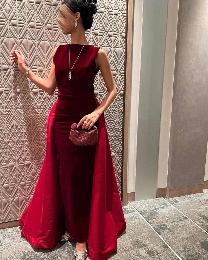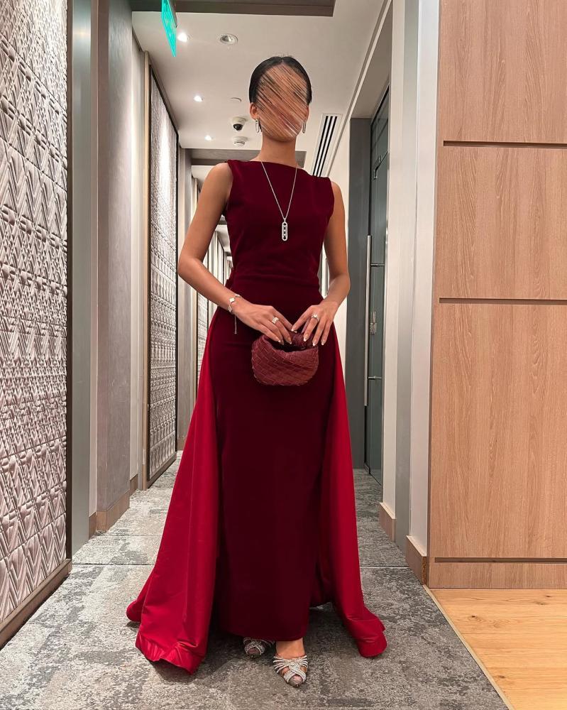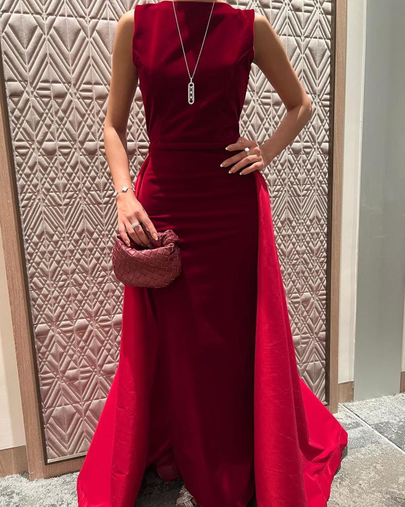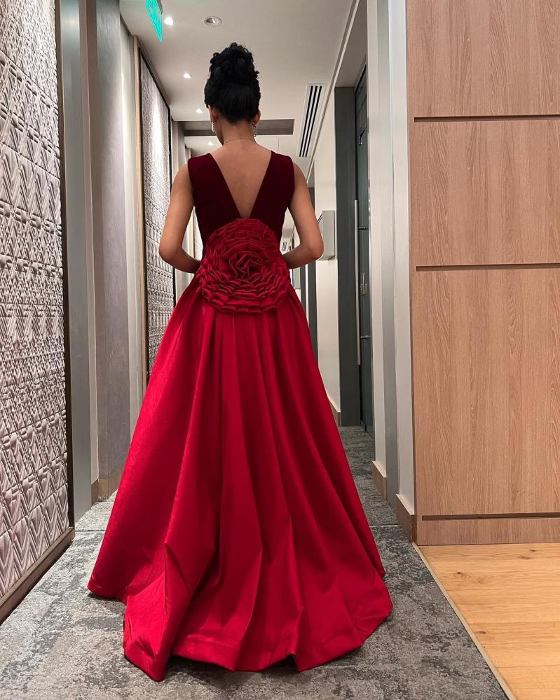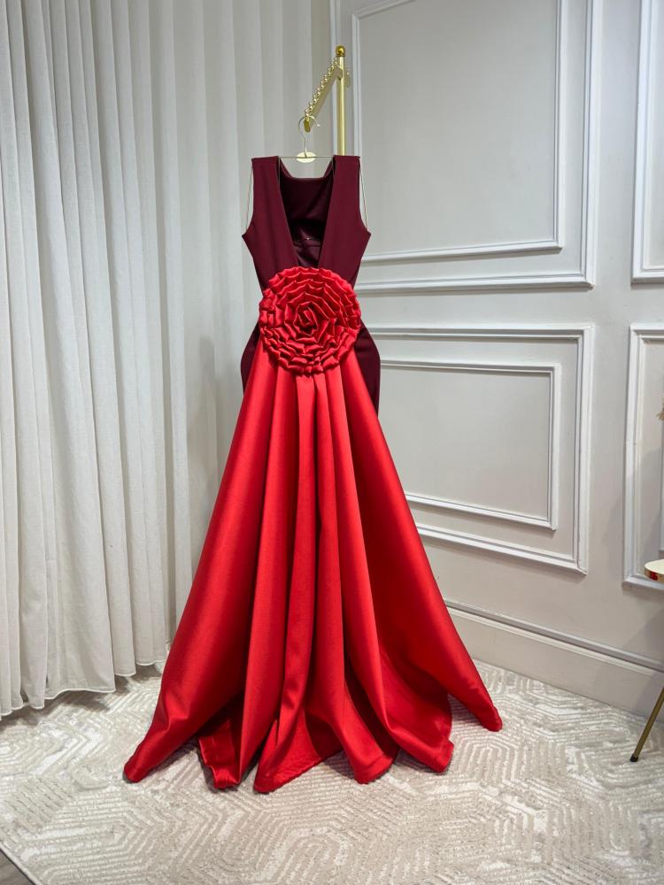* لون الجزء السفلي (الذيل): أحمر زاهي يضفي على الفستان حيوية وحيوية.