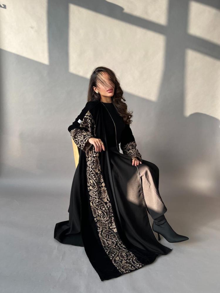 عباية مخمل وكريب ملكي مع شال مطرز مثبت بطقطق لتتيح لك لبس العباية بطرقتين بشال او بدونه.