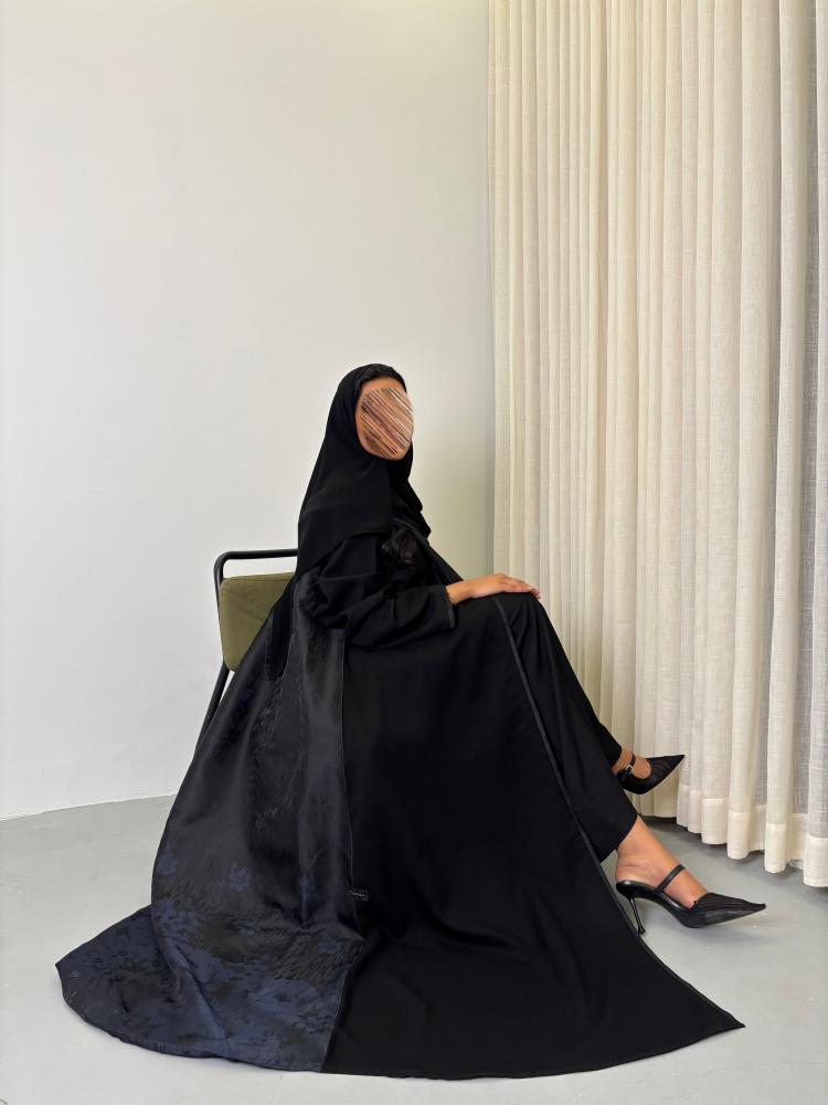 عباية كتان مع تفته أسود بطرف ورود زرقاء