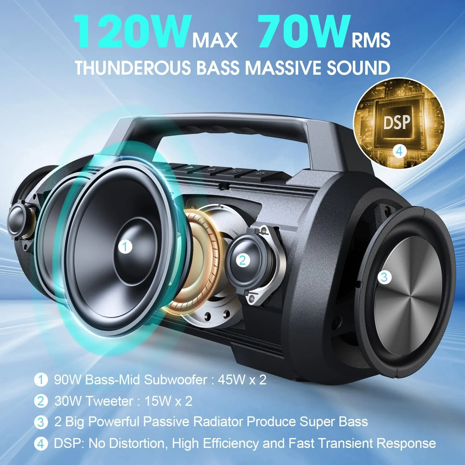 - 70 واط RMS (120 واط الذروة) بانشي باس:مكبرات صوت بلوتوث محمولة مزودة بمضخم صوت (مزدوج 35 وات) ومكبرات صوت (مزدوج 10 وات) ومشعات سلبية كبيرة مزدوجة لتوفير صوت جهير عميق للغاية وصوت ثلاثي واضح للغاية.يتميز مكبر الصوت المحمول أيضًا بشريحة DSP متقدمة قادرة على التخلص من التشويه وتشكيل صوت لاسلكي خالي من التشويه ومكبرات صوت هاي فاي تعمل بتقنية البلوتوث.