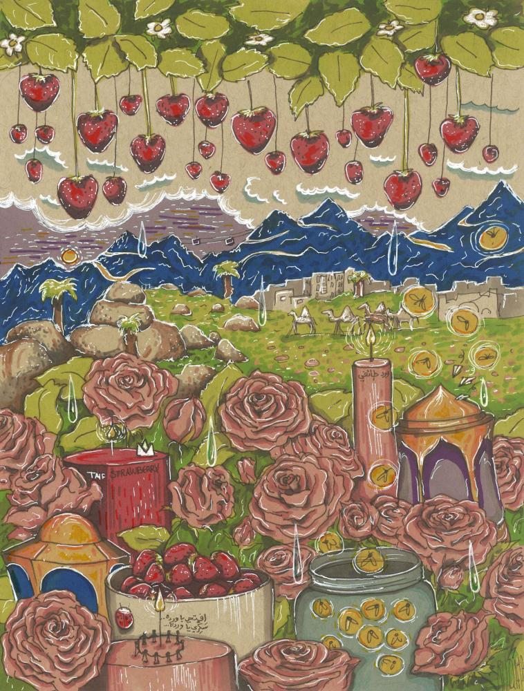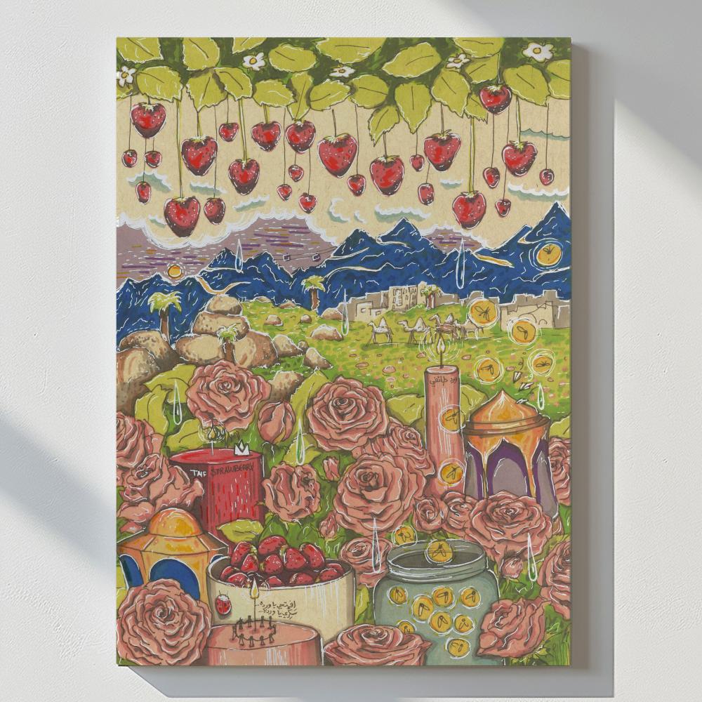 - رسم مطبوعة لمنطقة الطائف بالمملكة العربية السعودية خلال شهر رمضان المبارك في فصل الربيع.