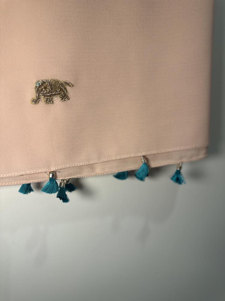 طرحة بلون الخربزي الصريح مطرز عليها (4) قطع على شكل لطيف بعين تركوازية 🐘🩵 بوم ينة اطرافها باضافات أسفل الطرحة ✨✨ ( لون التطريز ذهبي ) من طرح واحد 🐘🩵