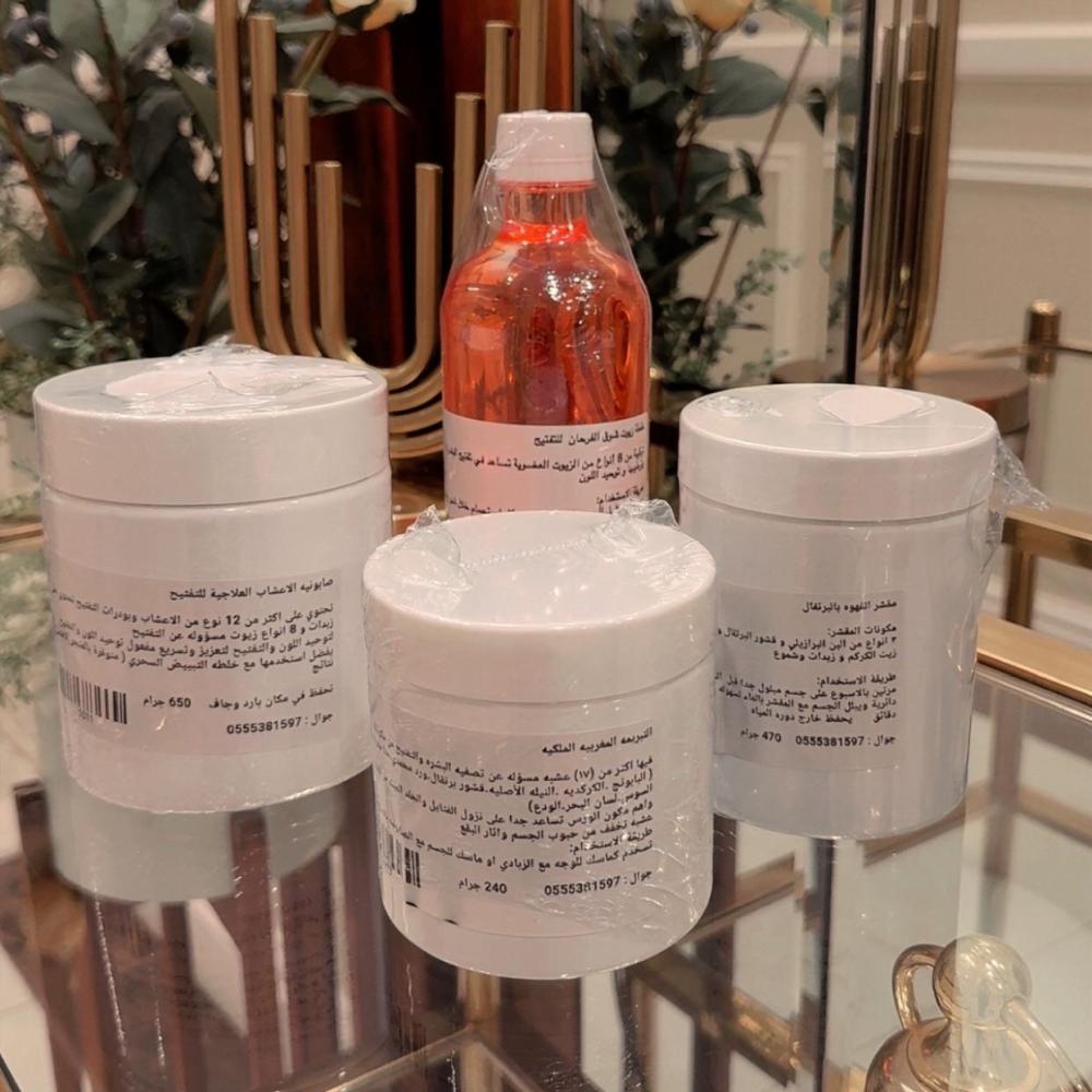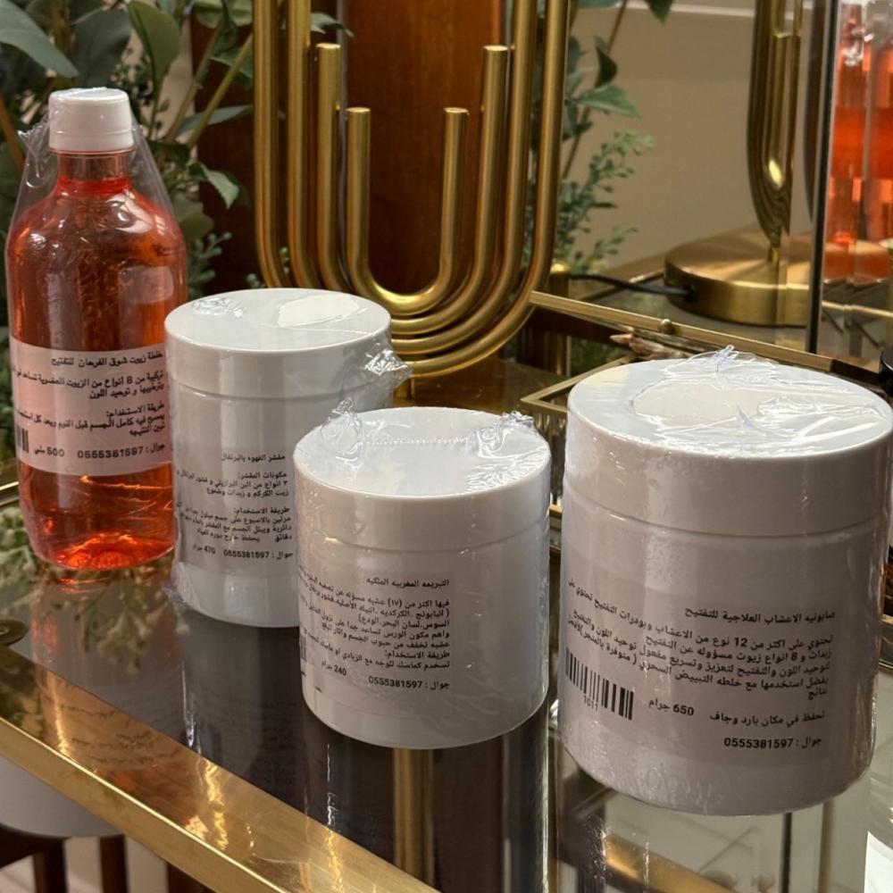 يحتوي على اهم الزيوت للتفتيح ( زيت البرتقال - زيت الكركم - زيت اللوز المر - زيت القهوه - زيت البرافين )