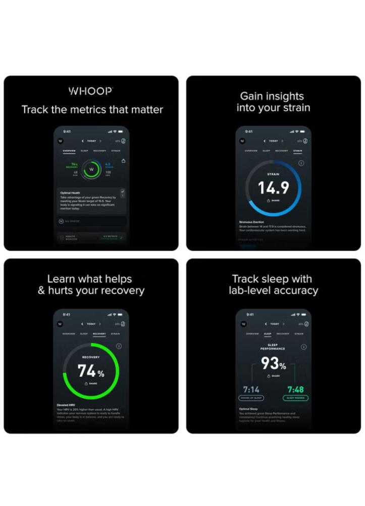 صُممت أجهزة تتبع اللياقة البدنية WHOOP، القائمة على المعرفة والمدعومة علميًا، للسماح للمستخدمين بفهم صحتهم العامة وتحسينها وتحسين أدائهم، حتى تتمكن من تسجيل السلوكيات اليومية مثل النشاط والنظام الغذائي والمزيد.