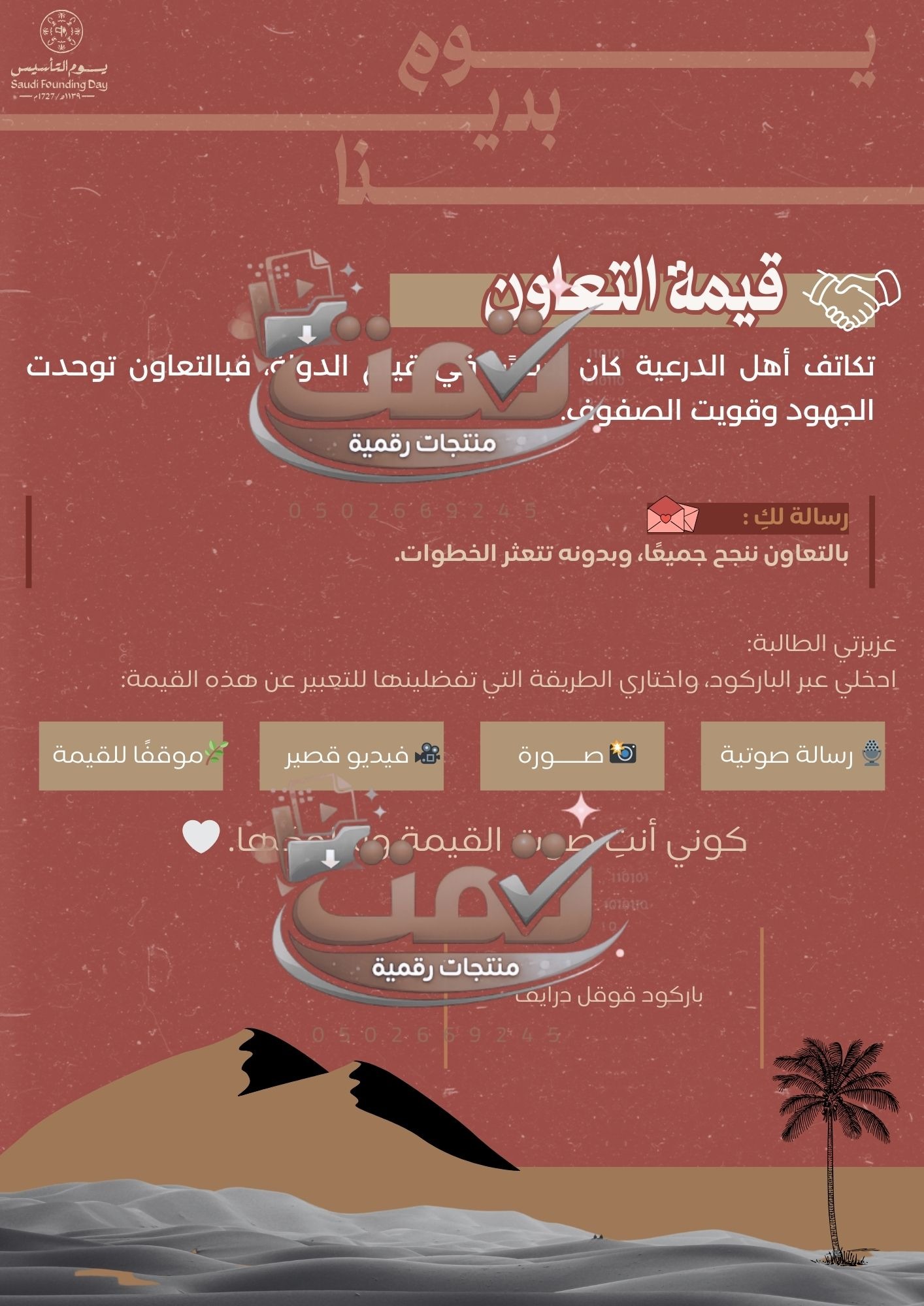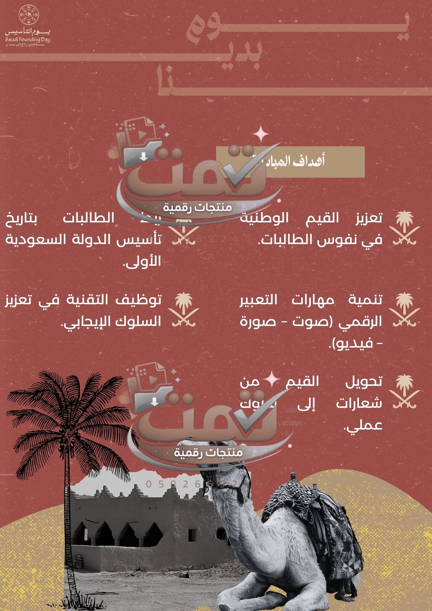 ملف إلكتروني متكامل صُمّم باحترافية عالية لتفعيل يوم التأسيس بطريقة تربوية رقمية، يربط بين قيم قيام الدولة السعودية الأولى وبناء شخصية الطالبة في الحاضر، بأسلوب تفاعلي حديث يخدم المدرسة والمعلمة والطالبات معًا.