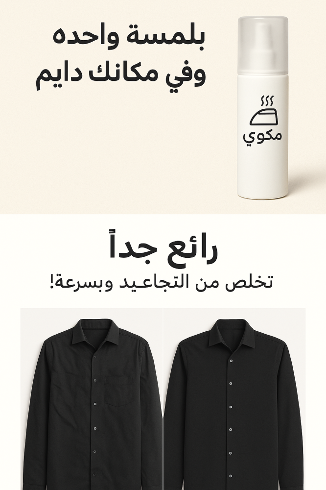 ليش تعذب نفسك بالكوي؟ رش بخاخ الكوي على قماشك، حرّك بيدك شوي، وخلاص! التجاعيد تختفي والقميص يرجع كأنه جديد، سهل وسريع بدون تعب ولا وجع راس.