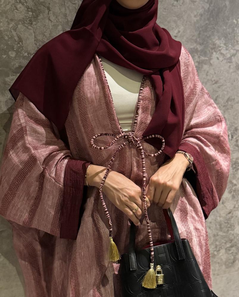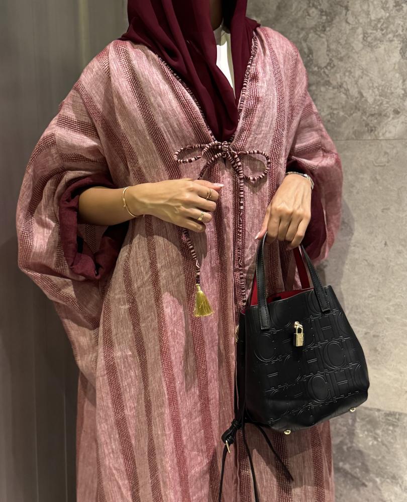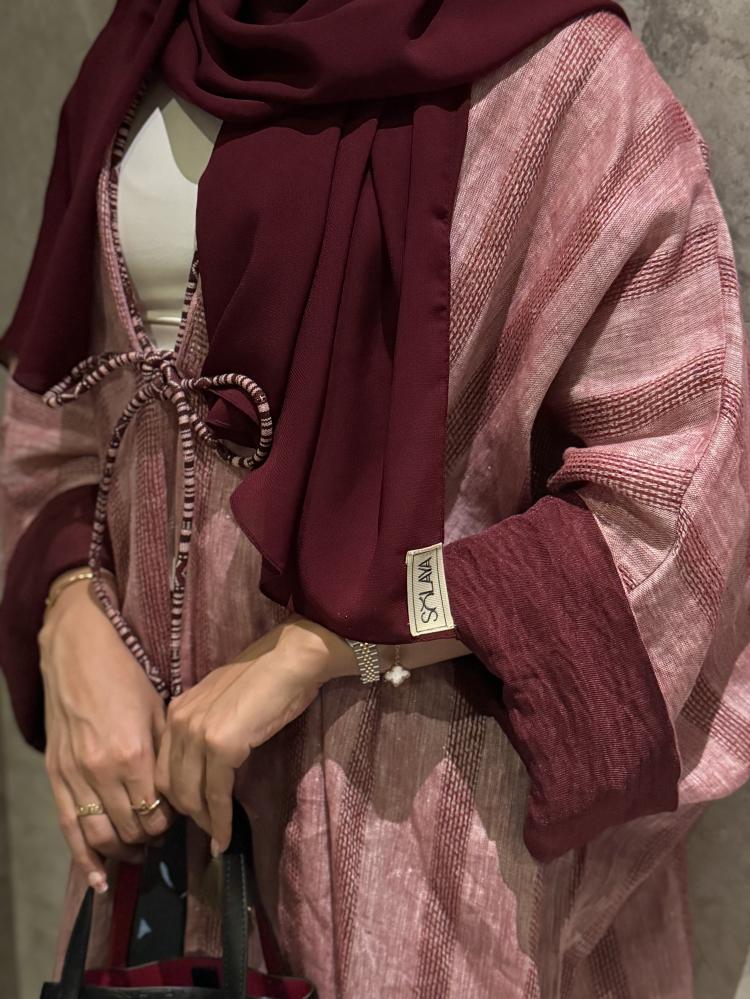 عباية قصة بشت خام لنن صيفي مع تفاصيل شبك تدرج اللون العنابي و اكمام واسعه باللون العنابي مريحة و عملية مع شيلة نفس لون الاكمام