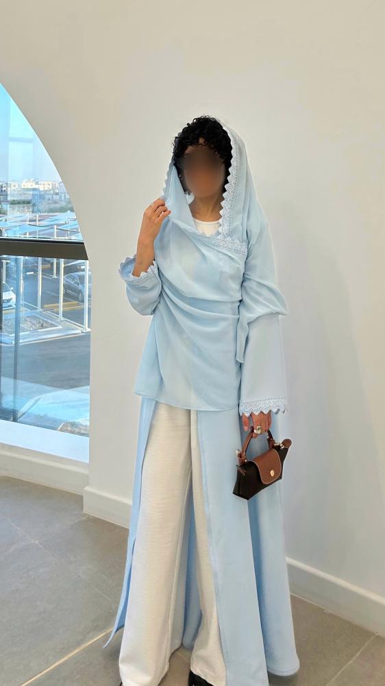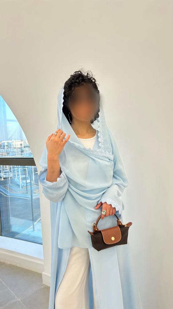 عبايه صيفيه من قماش كريب اندنوسي لون سماوي مع كلفه بالاكمام بقصه نص كلوش