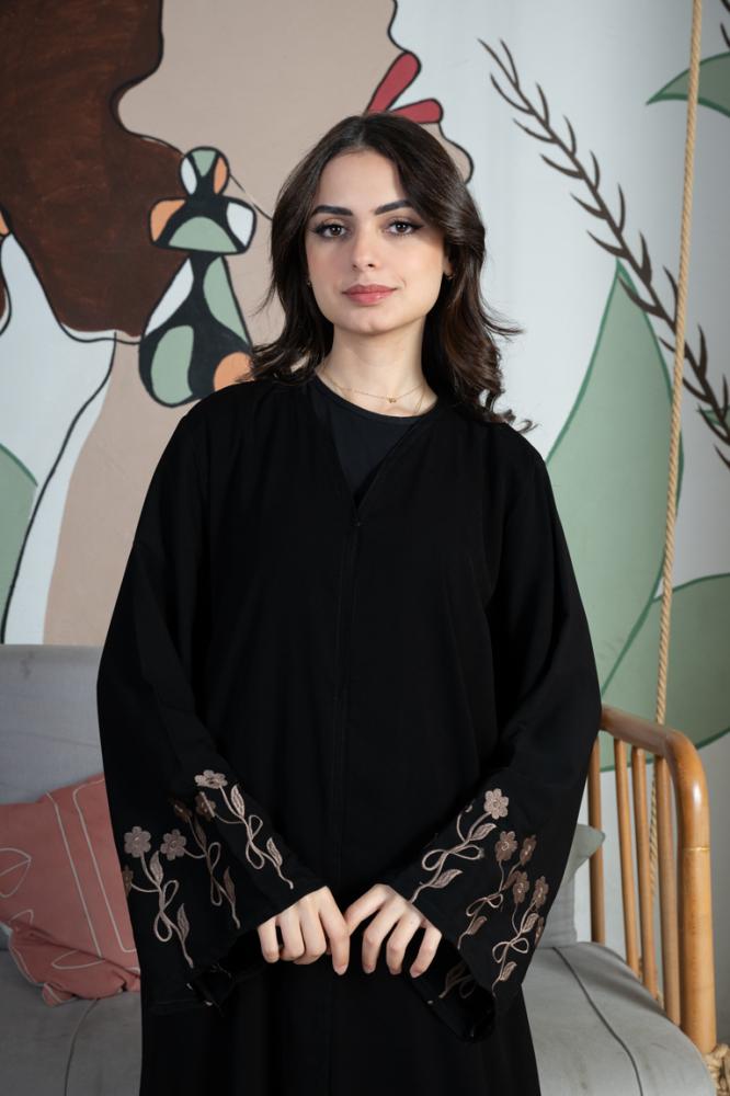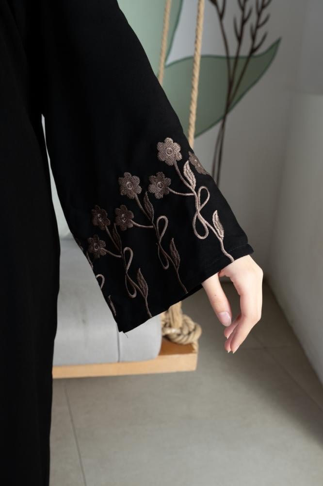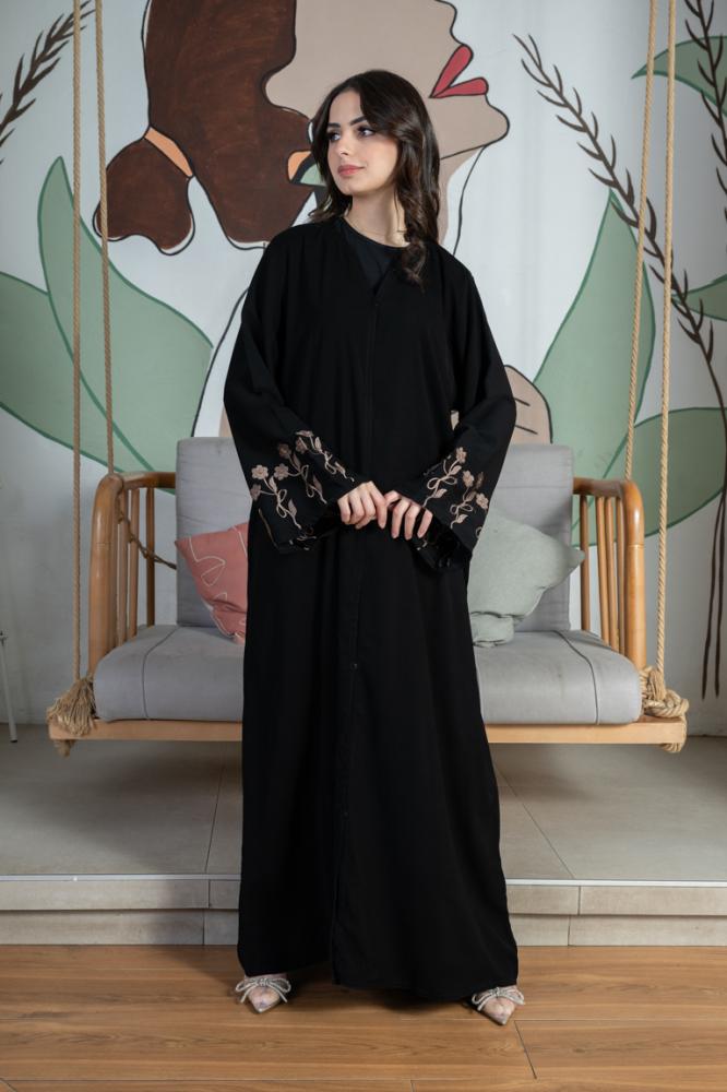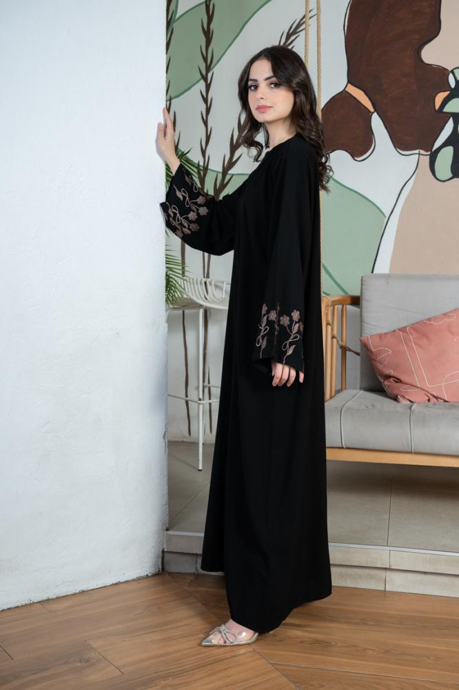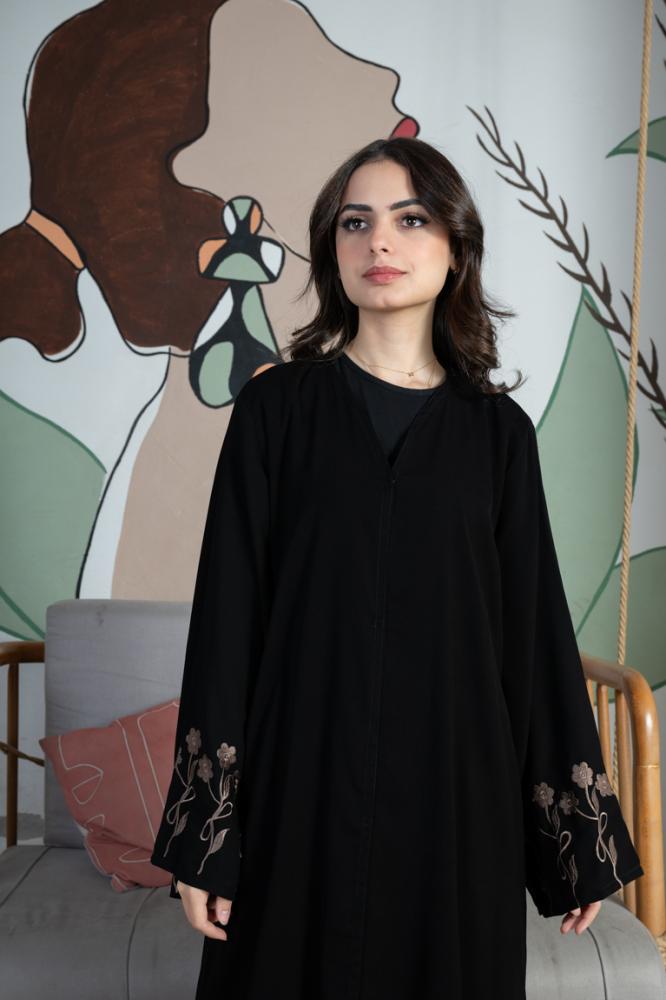 تتميز العباية بـ قصة الكم المربع الواسعة، التي توفر مظهراً مريحاً وحراً عند الأيدي. أما التفصيل الذي يميزها فهو التشجيرة المتقنة باللون البني المميز، والموجودة على الأكمام، حيث تكسر حدة السواد بلمسة لونية ترابية ودافئة تزيدها فخامة وهدوءاً. وتعتمد العباية على قفلة الطقطق، لسهولة الإغلاق والحفاظ على شكل العباية المرتب.