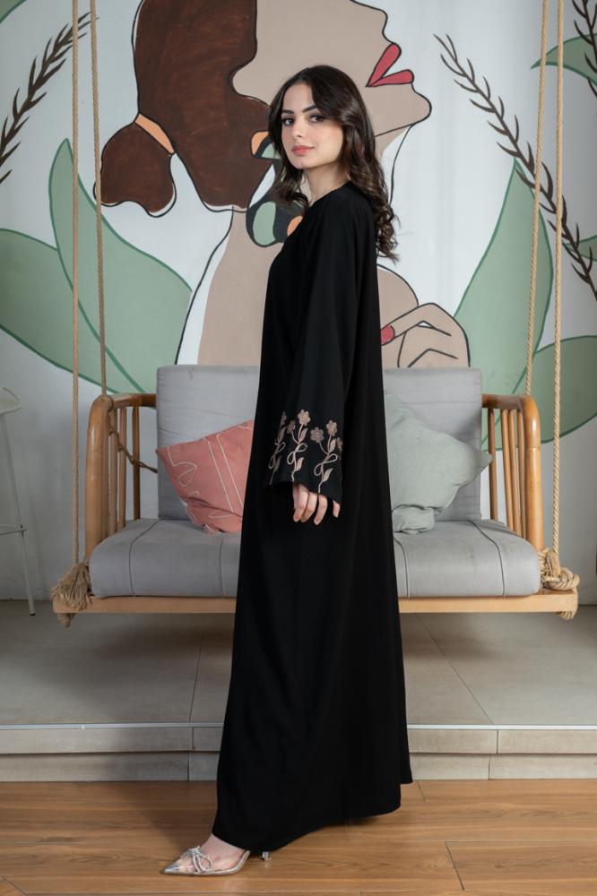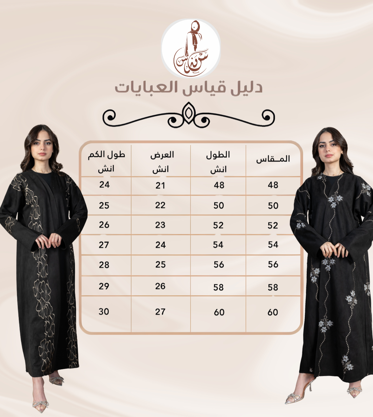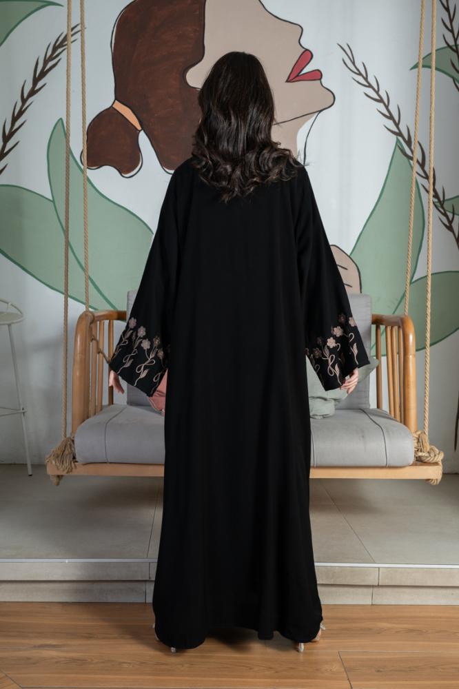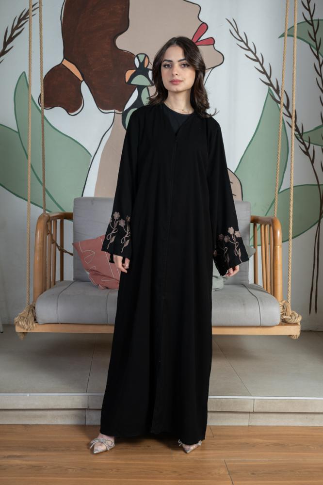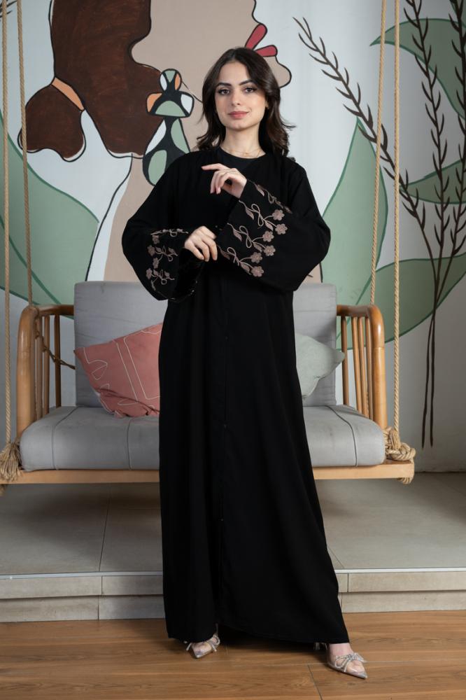 تتميز العباية بـ قصة الكم المربع الواسعة، التي توفر مظهراً مريحاً وحراً عند الأيدي. أما التفصيل الذي يميزها فهو التشجيرة المتقنة باللون البني المميز، والموجودة على الأكمام، حيث تكسر حدة السواد بلمسة لونية ترابية ودافئة تزيدها فخامة وهدوءاً. وتعتمد العباية على قفلة الطقطق، لسهولة الإغلاق والحفاظ على شكل العباية المرتب.