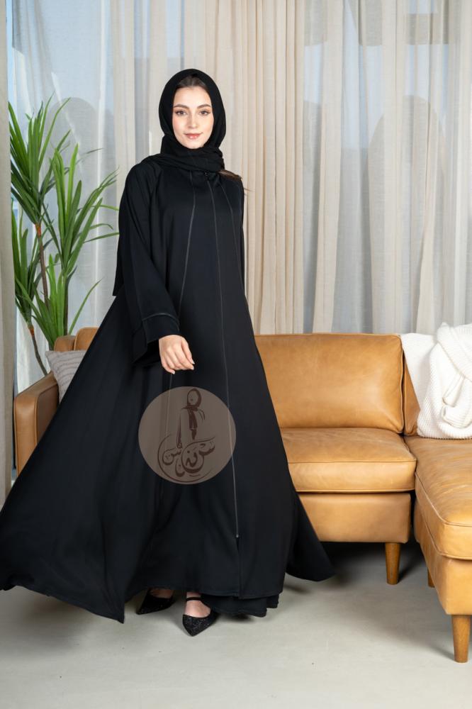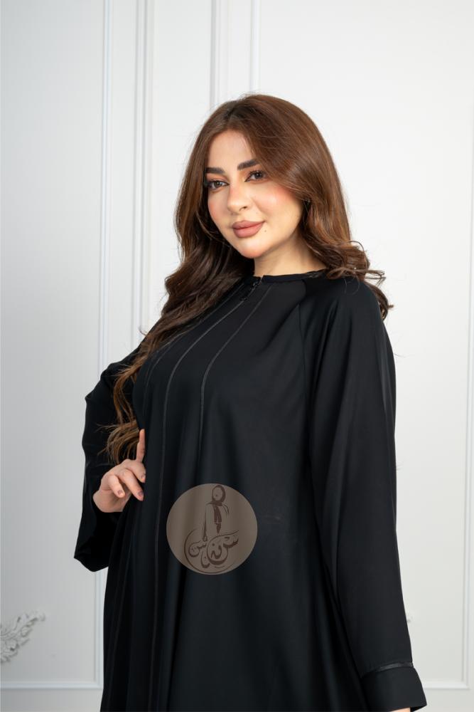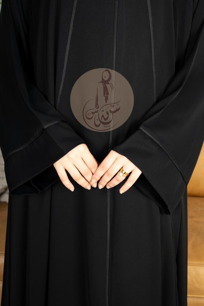 - التفاصيل: عباية سادة مع قيطان أسود (سواء كان شريطاً من القماش أو خياطة بارزة) يزين الواجهة أو الأكمام.