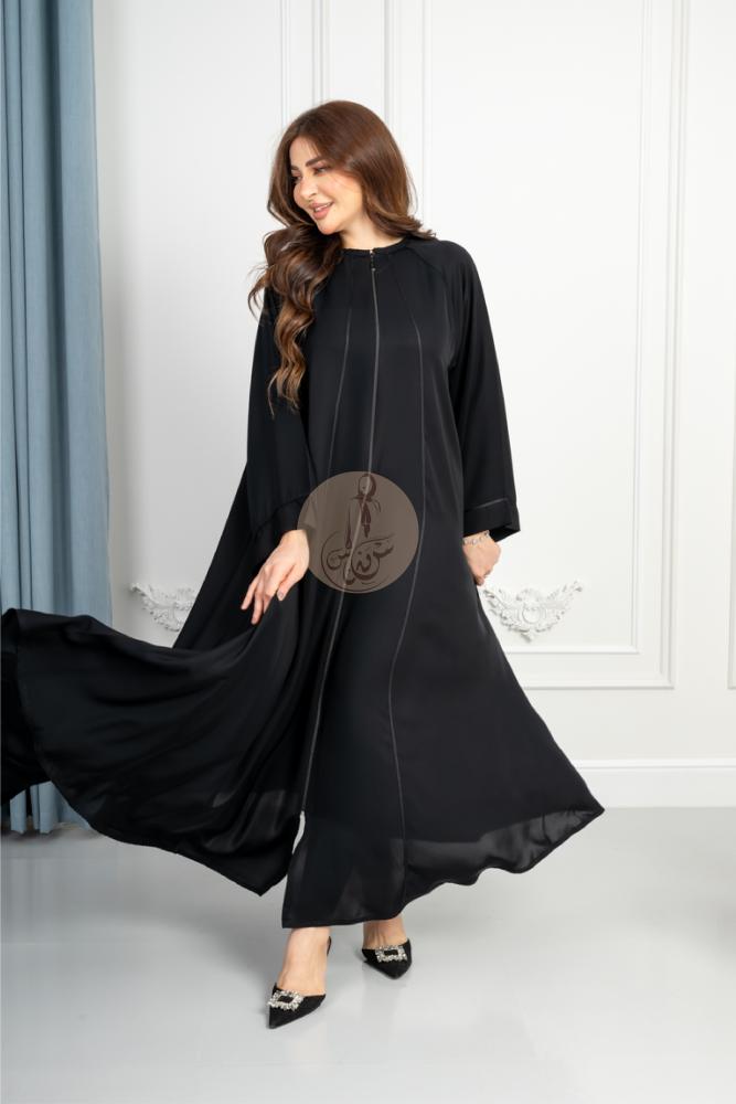 تألقي بإطلالة تعكس الرقي الهادئ والنعومة الفائقة مع هذه العباية الكلوش الفاخرة. صُنعت العباية من قماش الحرير، الذي يشتهر بانسداله الجذاب وملمسه البارد، مما يجعلها مثالية للمناسبات الخاصة والاستخدام الراقي.