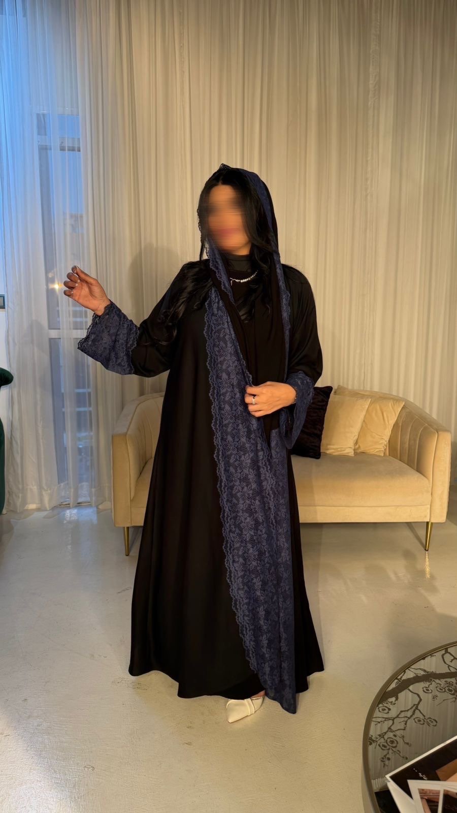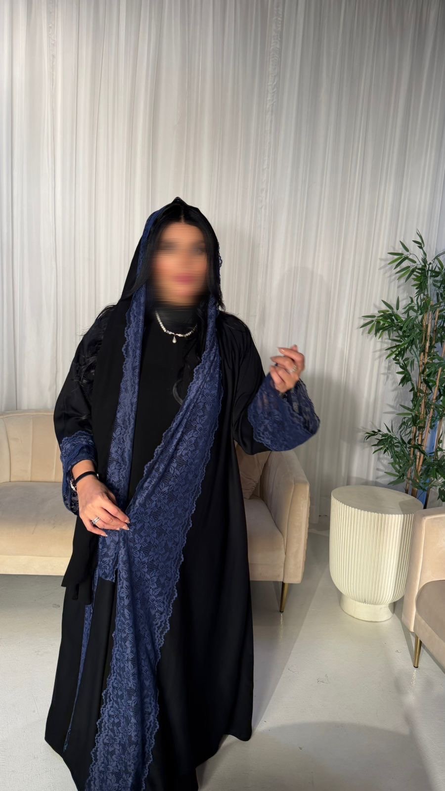 - الإضافات: دانتيل كحلي فاخر على الأكمام، كامل أطراف العباية، وطرف الطرحة.