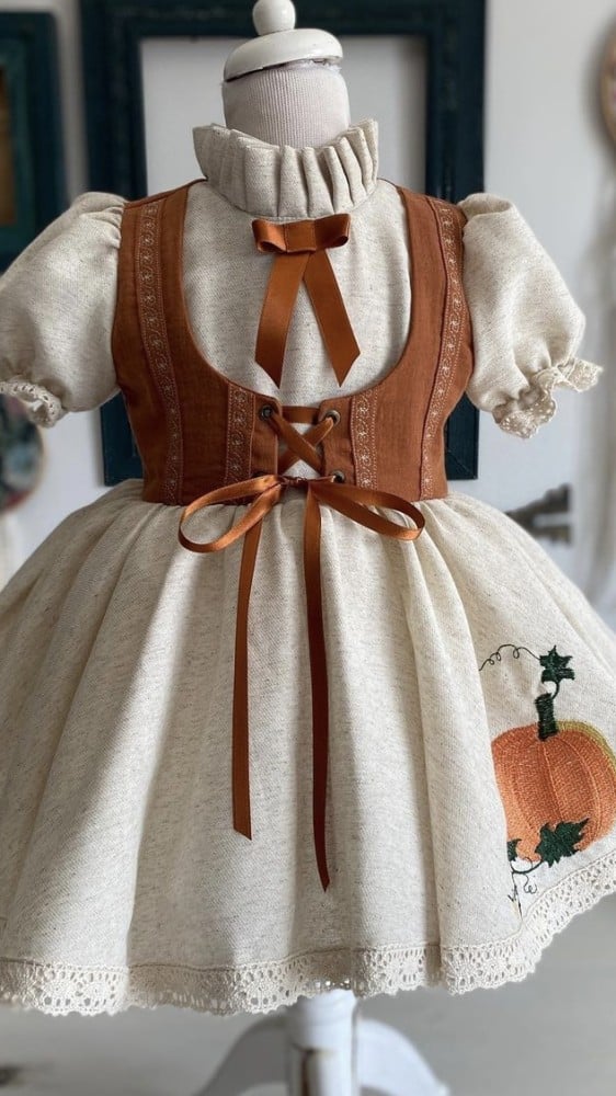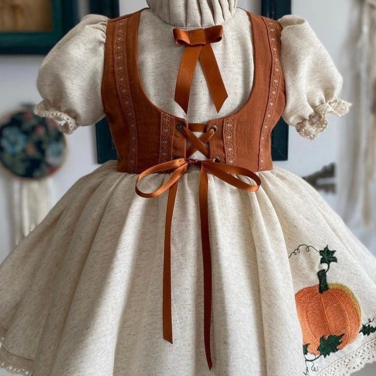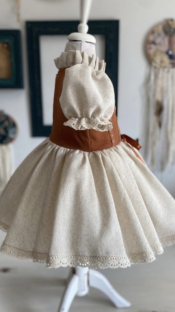 فستان فيكتوري باللون البيج باكمام قصيرة