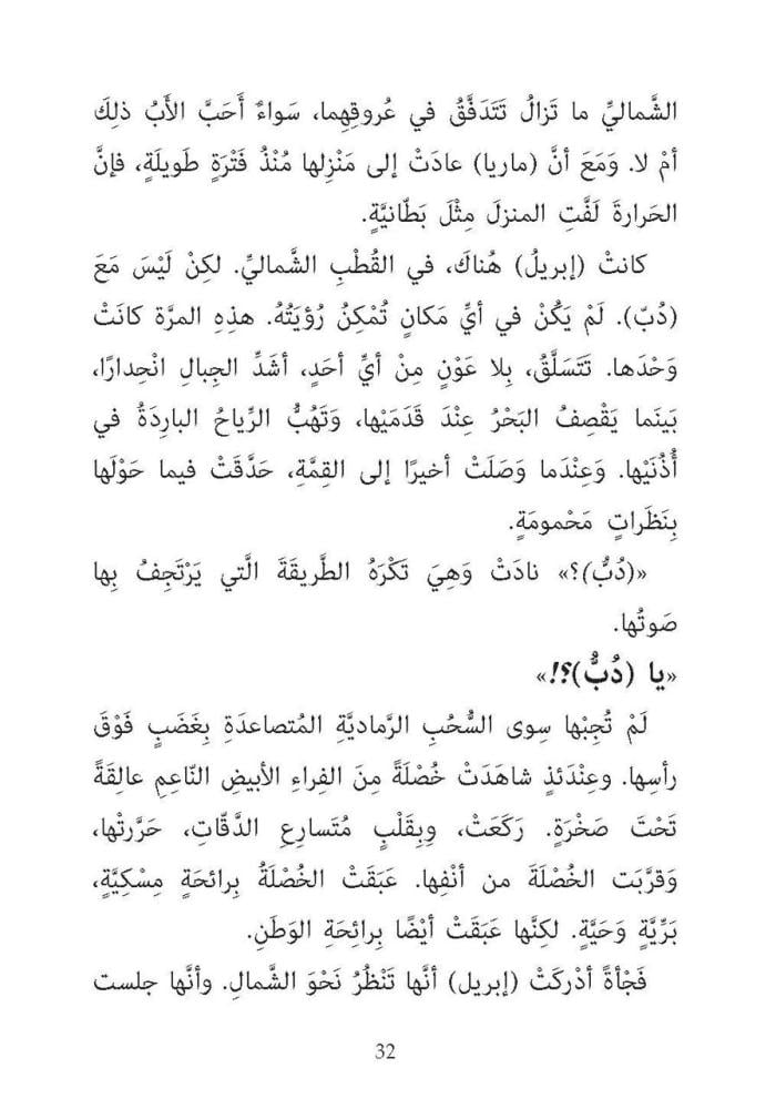 " وعندئذ خطا ( دب) ببطء إلى جانب. وهناك خارجًا من أعماق الكهف الخفية، متأرجحًا على أربع أقدام غير مستقرة، كان شبل دب قطبي صغير."