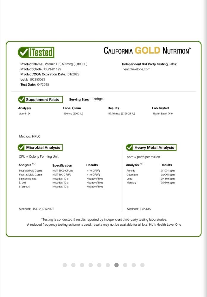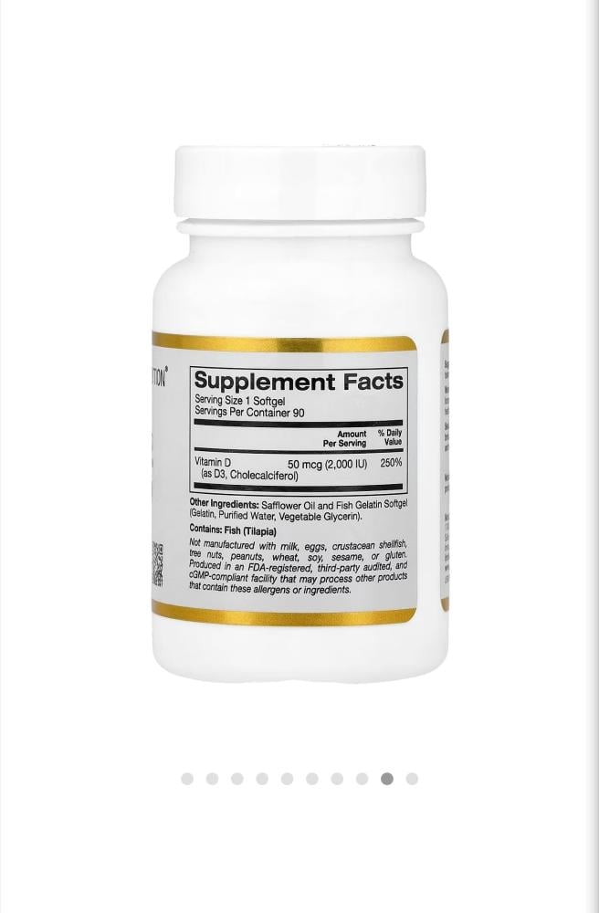 California Gold Nutrition® فيتامين د3، 125 ميكروجرام (5000 وحدة دولية) هو مكمل غذائي عالي الفعالية من فيتامين د ويحتوي على كوليكالسيفيرول في كبسولات هلامية من الجيلاتين السمكي.