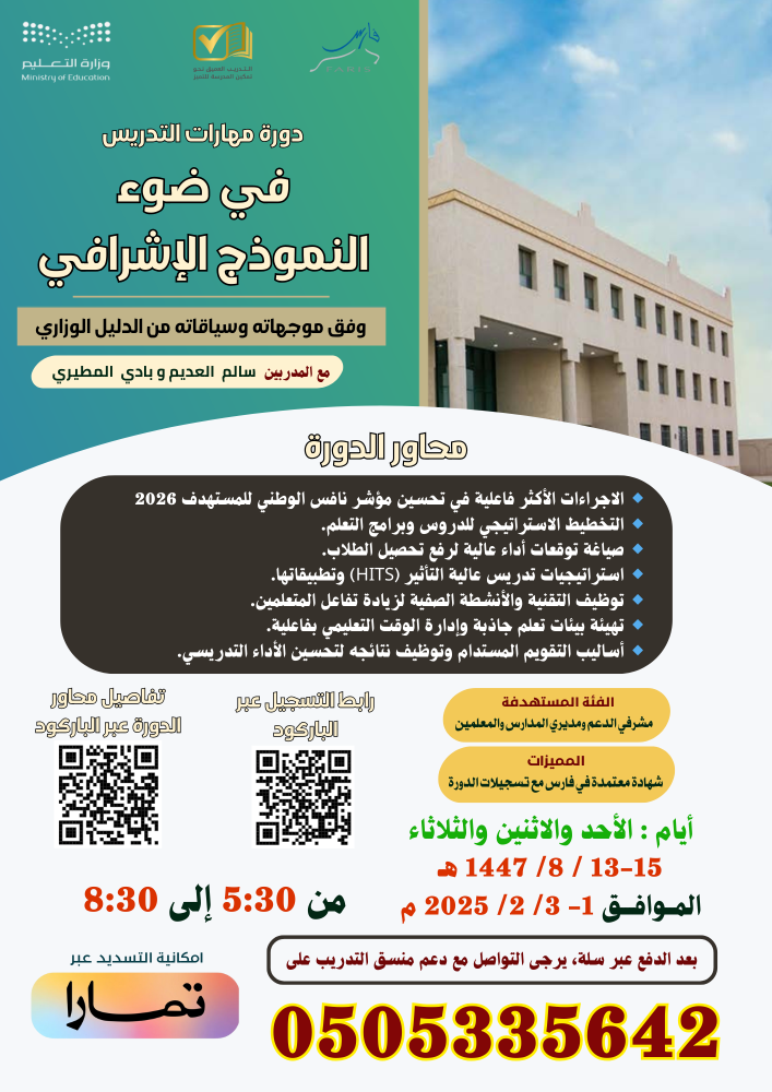 - 🎯 محاور الدورة: فهم النموذج الإشرافي وأدواره في تمكين المدرسة.
