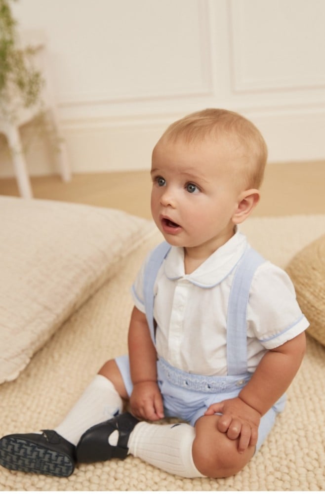 1-أوفرول شورت بلون الأزرق الفاتح وقميص ابيض بياقه مستديره وجوارب متناسقه مع رسمة القارب الانيقه قطن 100% ,NEXT