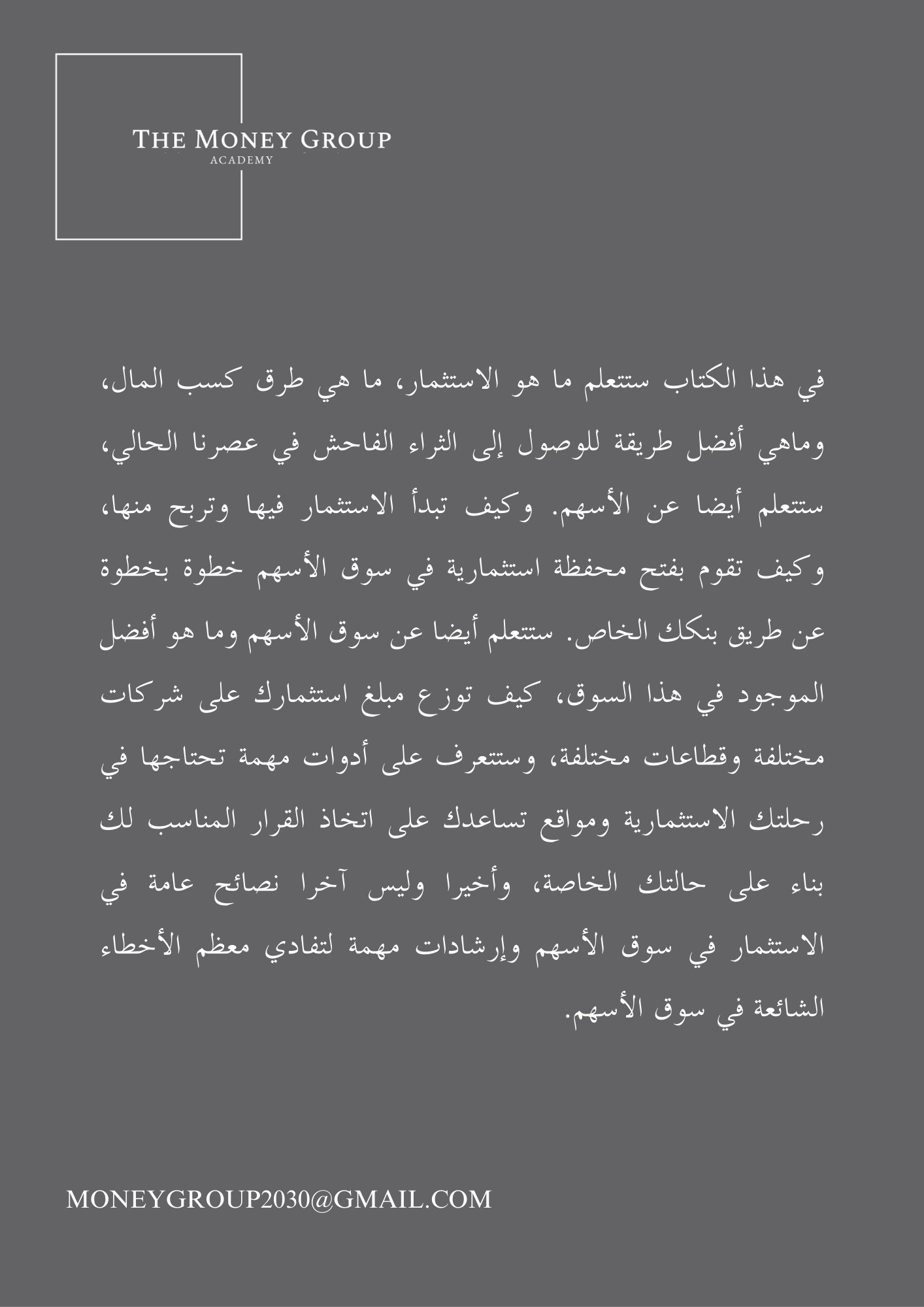 في هذا الكتاب ستتعلم ما هو الاستثمار، ما هي طرق كسب المال، وماهي أفضل طريقة للوصول إلى الثراء الفاحش في عصرنا الحالي، ستتعلم أيضا عن الأسهم. وكيف تبدأ الاستثمار فيها وتربح منها، وكيف تقوم بفتح محفظة استثمارية في سوق الأسهم خطوة بخطوة عن طريق بنكك الخاص. ستتعلم أيضا عن سوق الأسهم وما هو أفضل الموجود في هذا السوق، كيف توزع مبلغ استثمارك على شركات مختلفة وقطاعات مختلفة، وستتعرف على أدوات مهمة تحتاجها في رحلتك الاستثمارية ومواقع تساعدك على اتخاذ القرار المناسب لك بناء على حالتك الخاصة، وأخيرا وليس آخرا نصائح عامة في الاستثمار في سوق الأسهم وإرشادات مهمة لتفادي معظم الأخطاء الشائعة في سوق الأسهم. (E-BOOK) هذا المنتج للأشخاص الذين لديهم فضول عن سوق الأسهم والمال وطرق رفع الدخل بشكل عام. سيتيح لك هذا المنتج مقدمة بسيطة عن المال وسوق الأسهم وكيف تصل إلى الحرية المالية عن طريق الاستثمار في سوق الأسهم.