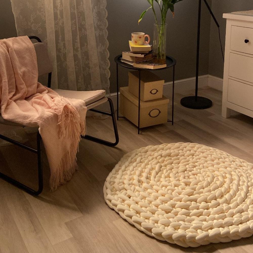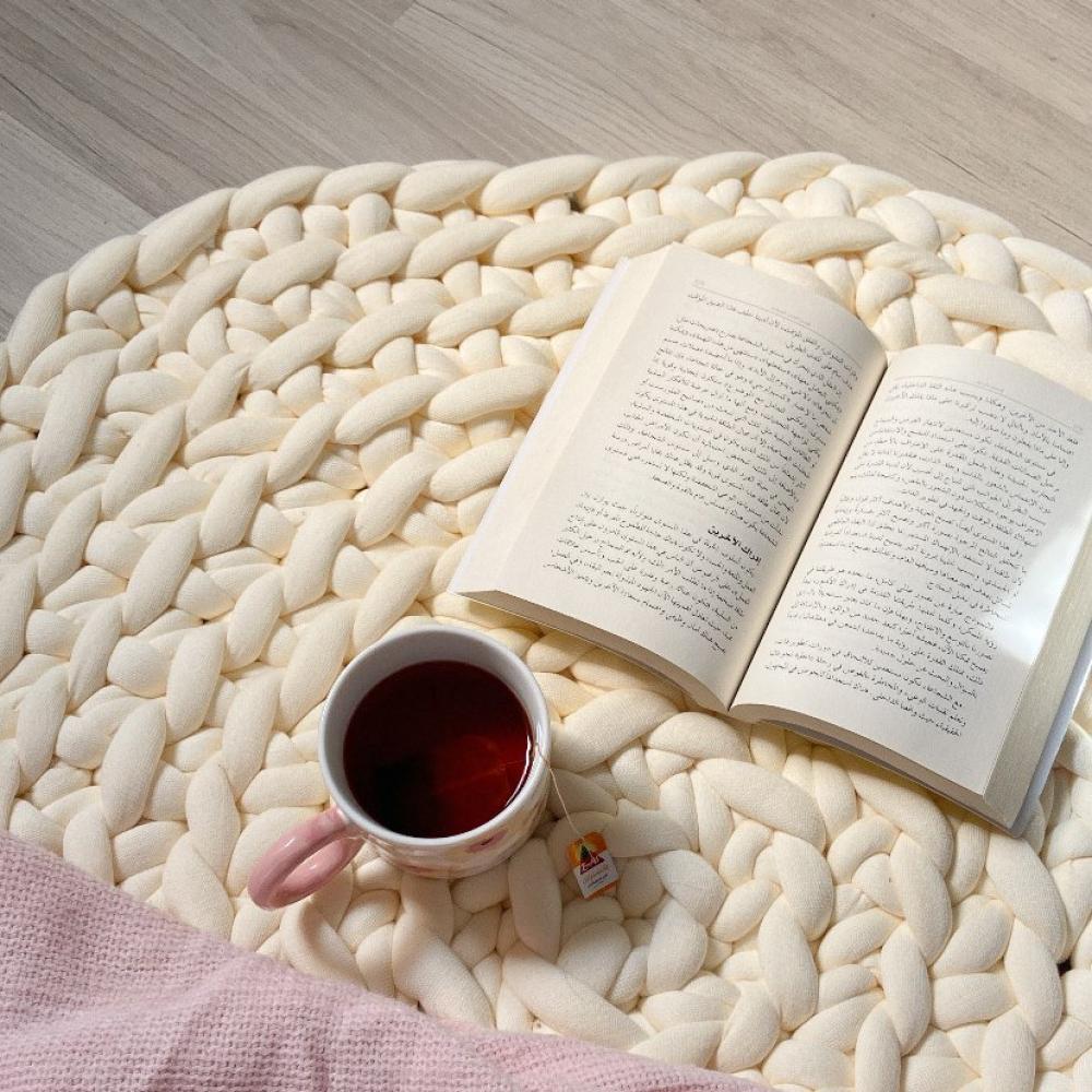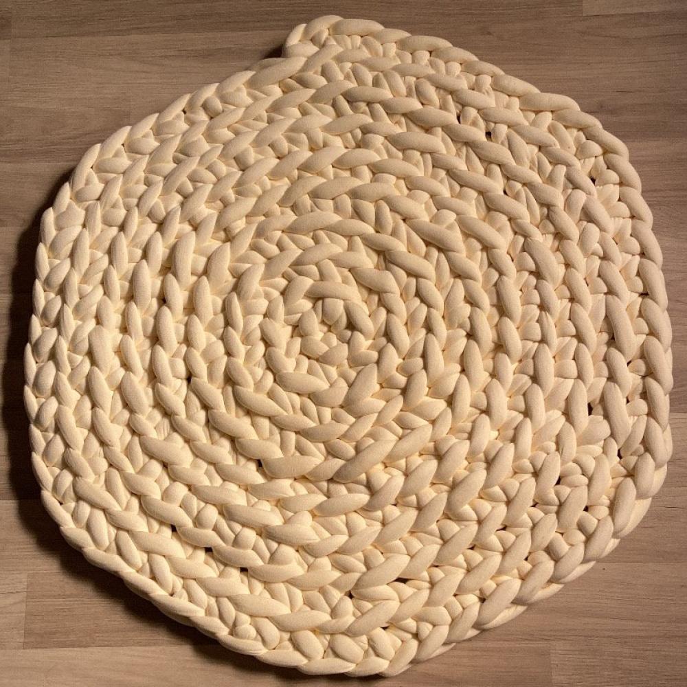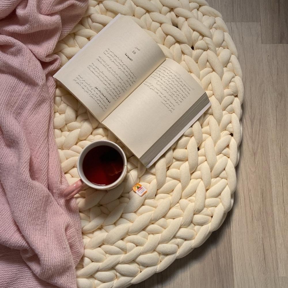 سجادة بيضاء دائرية مصنوعة يدوياً، تتميز بتصميم بسيط و فريد